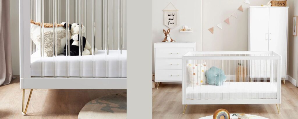 Best for: Parents craving a sleek, modern nursery with a minimalist edge β ideal if you want something different but still timeless, with standout acrylic details that make a statement.