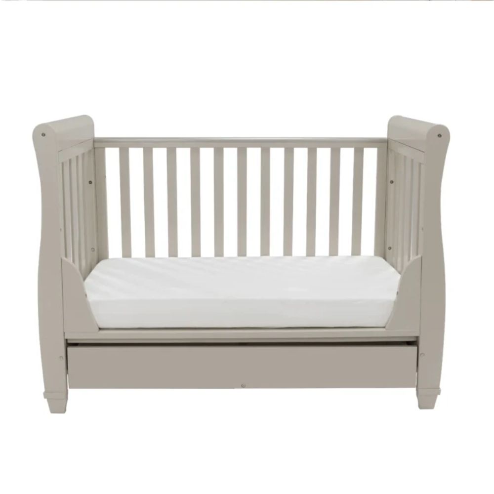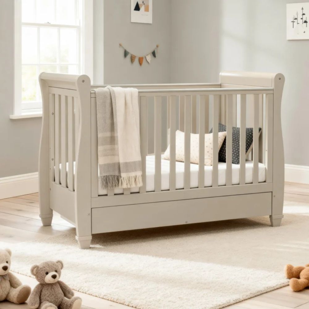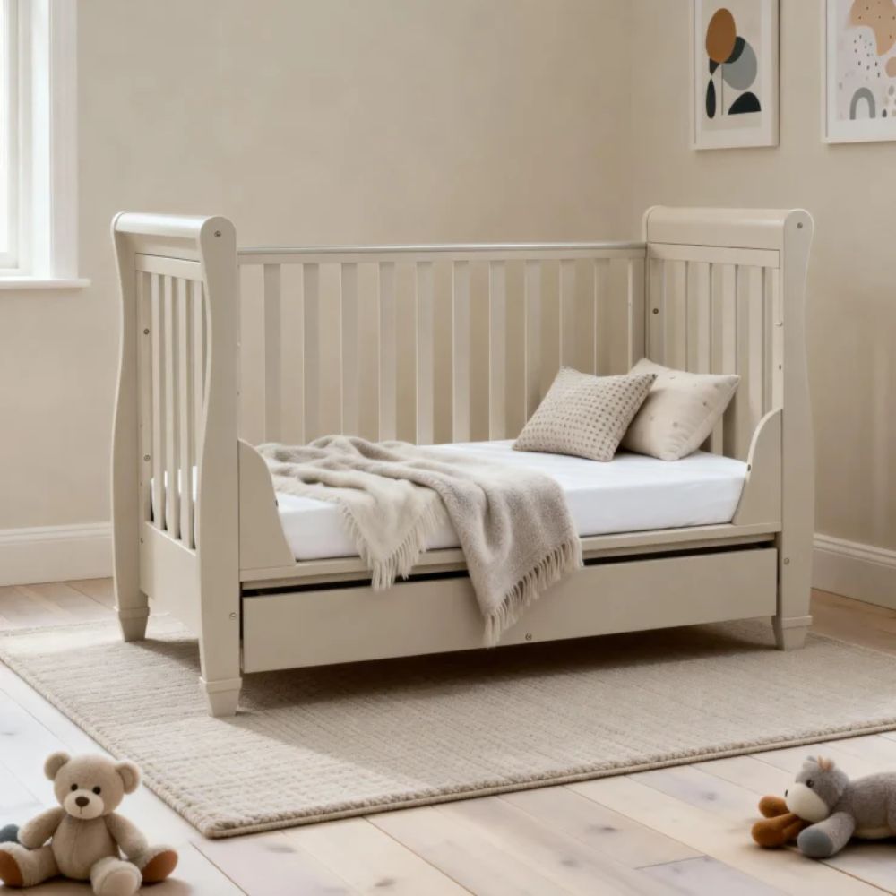 Three different mattress heights are available on the Eva Sleigh Cot Bed, making it the perfect sleeping environment for your growing baby. The Eva can be quickly transformed from a cot into a beautiful toddler bed once your little one is ready to graduate from the cot. But the Eva Sleigh’s usefulness doesn’t end when the baby reaches toddlerhood, as it can be turned into a sofa, which is great for parents to cuddle with their kids while reading them bedtime stories.