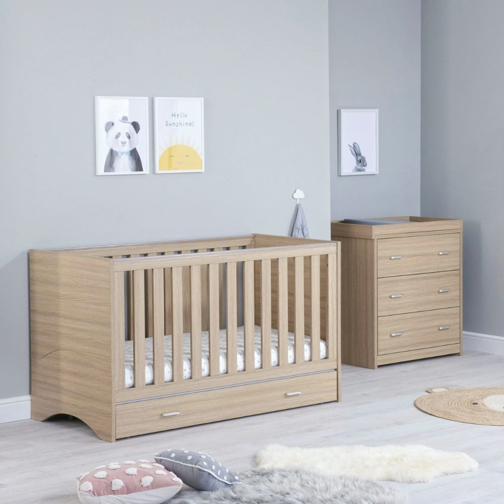The Babymore Veni range offers a modern, warm, and clean design, with its neat lines and a beautifully textured Warm Oak wood effect finish. It will sit stylishly in your baby’s nursery. This 2-piece room set consists of the Veni cot bed & changing unit.