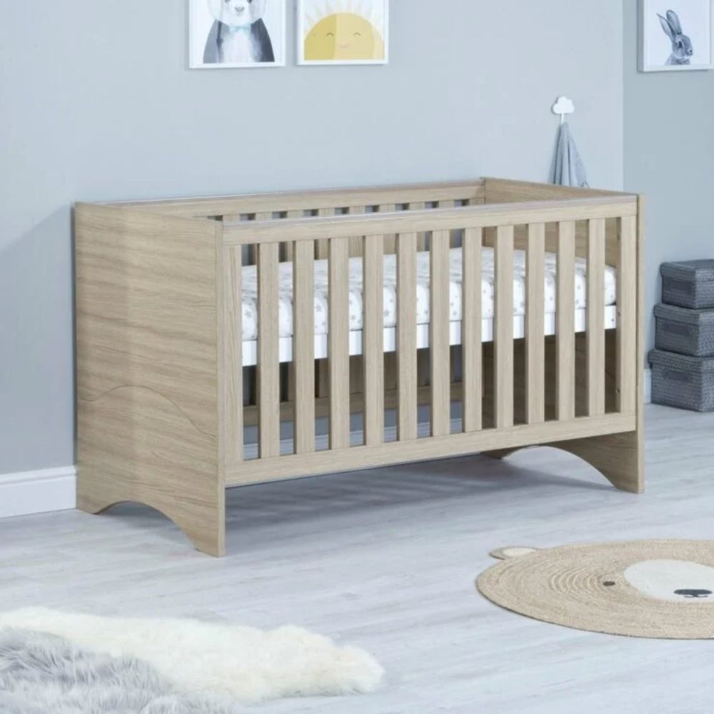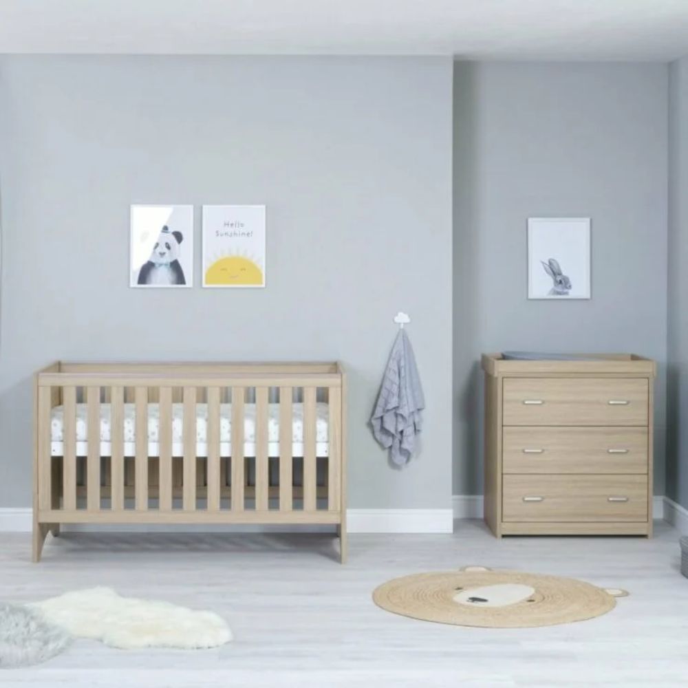 The Babymore Veni range offers a modern, warm, and clean design, with its neat lines and a beautifully textured Warm Oak wood effect finish. It will sit stylishly in your baby’s nursery. This 2-piece room set consists of the Veni cot bed & changing unit.