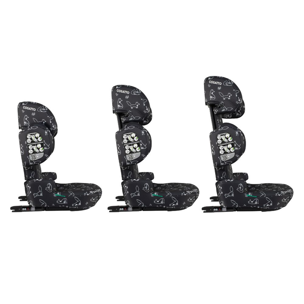 Ninja i-Size i-Go R129 grows with your child from 100cm to 150cm (approx. 4 years to approx. 12 years). The adjustable head restraint and backrest adapt effortlessly to each growth stage, delivering comfort and reliable safety from preschool to pre-teen.