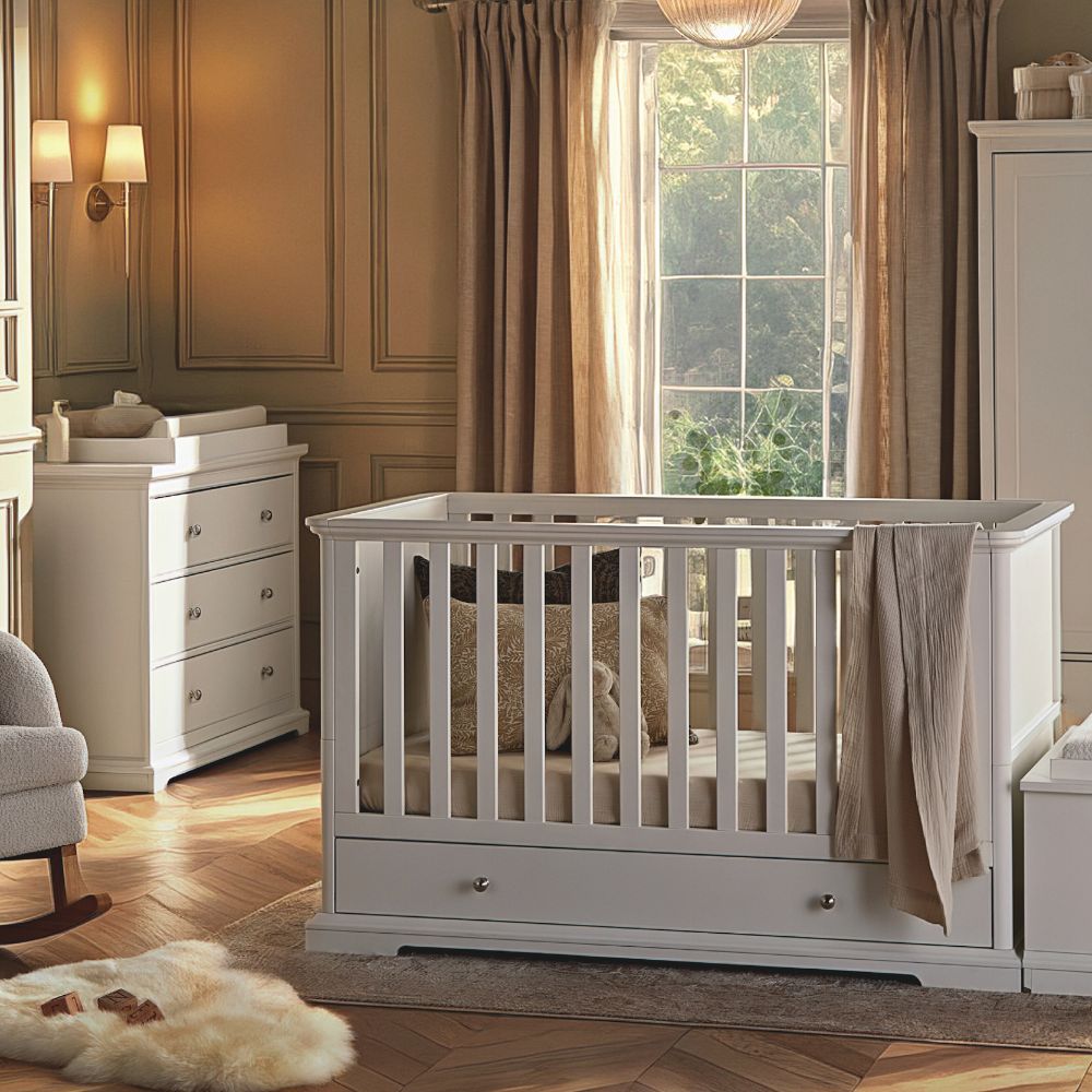 The set includes the Beaumont Cot Bed & Dresser Changer. Co-ordinating wall shelf and storage box available, designed to create a cohesive nursery.