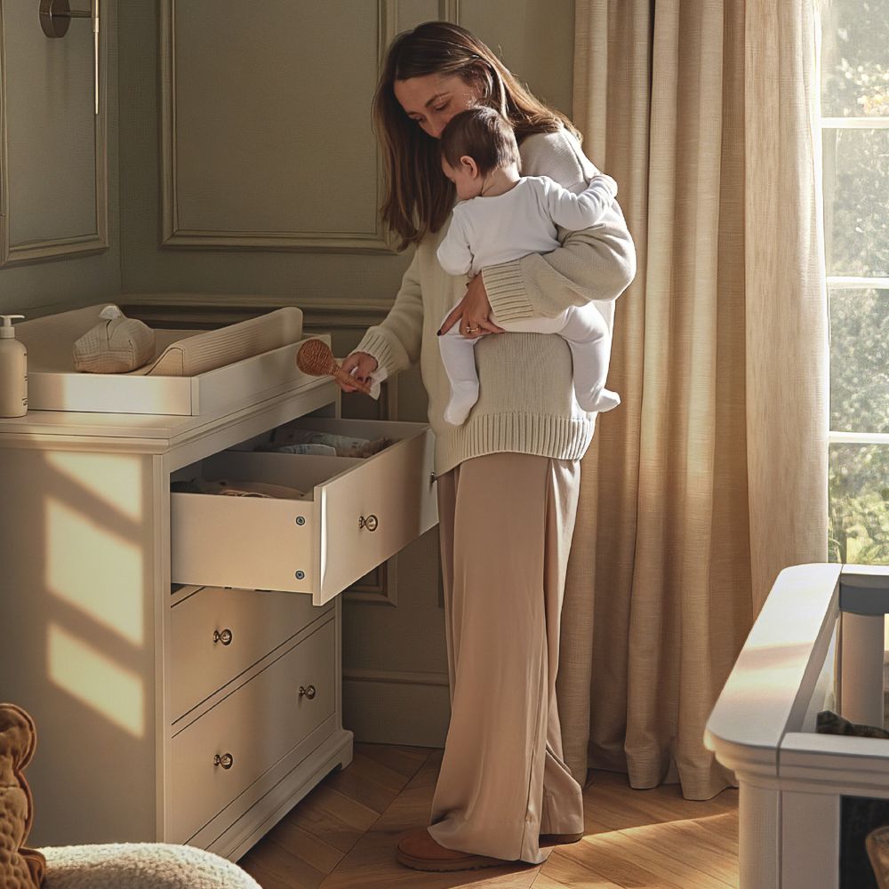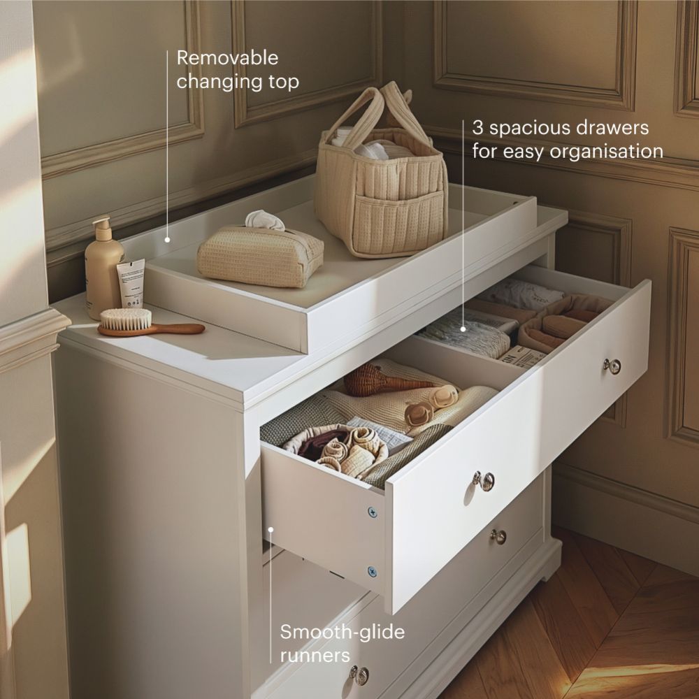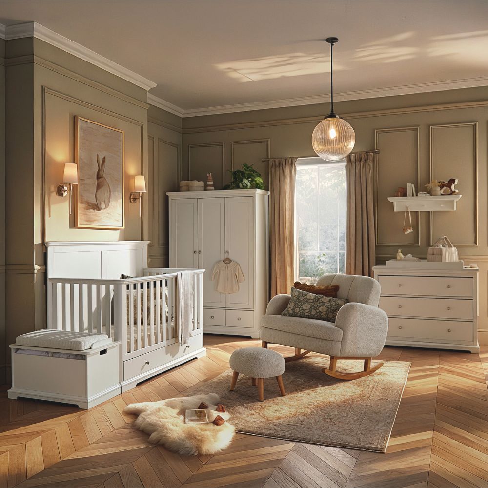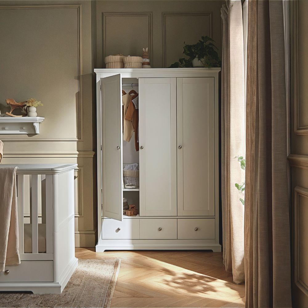 The matching dresser changer and full-height triple wardrobe provide generous, flexible storage for changing, dressing and organising essentials. With deep drawers, removable changing top, hanging rails, shelving and a wide lower drawer, the set is designed to support family life from newborn through to toddler years.