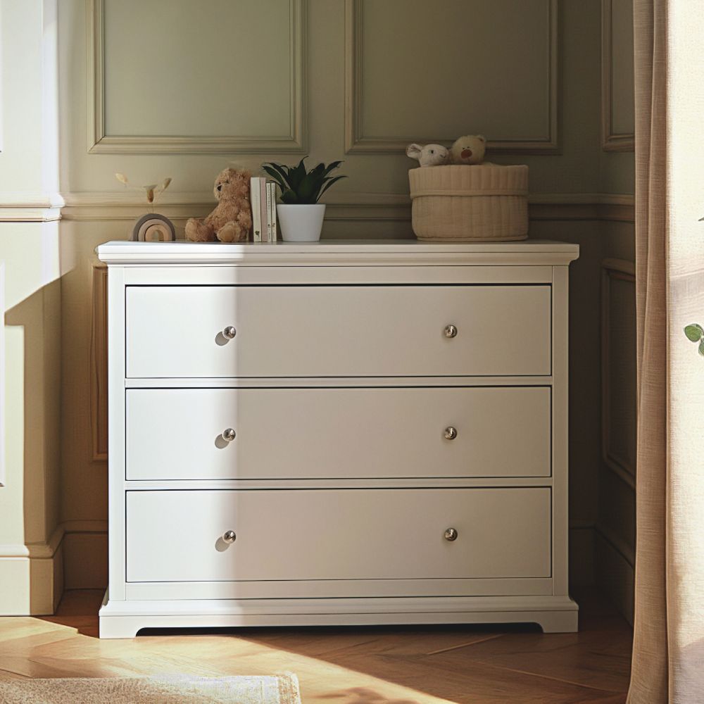 The CuddleCo Beaumont Grand 3 Piece Nursery Furniture Set brings together American-inspired design and everyday practicality. At its centre is the Beaumont Grand Cot Bed, with a tall panelled headboard, solid construction and adjustable mattress base positions that convert into a day bed as your child grows.