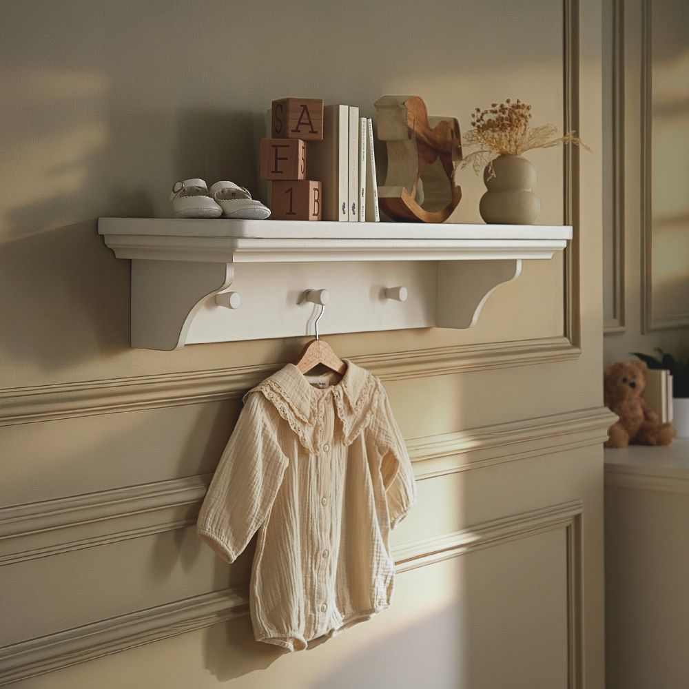 - Wall-mounted shelf helps keep nursery floors clear and organised
