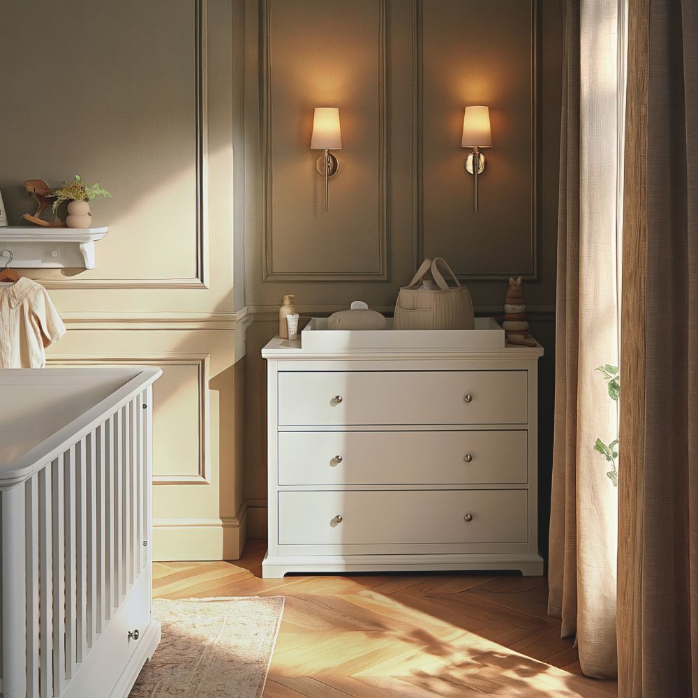 Beaumont offers generous storage, elevated features and adaptable elements that support your family throughout the years. From the cot bed that converts into a toddler bed, to the removable changing top on the dresser, to the full height triple wardrobe. Design details include substantial plinth, decorative cornice, soft close throughout and beehive chrome handles.