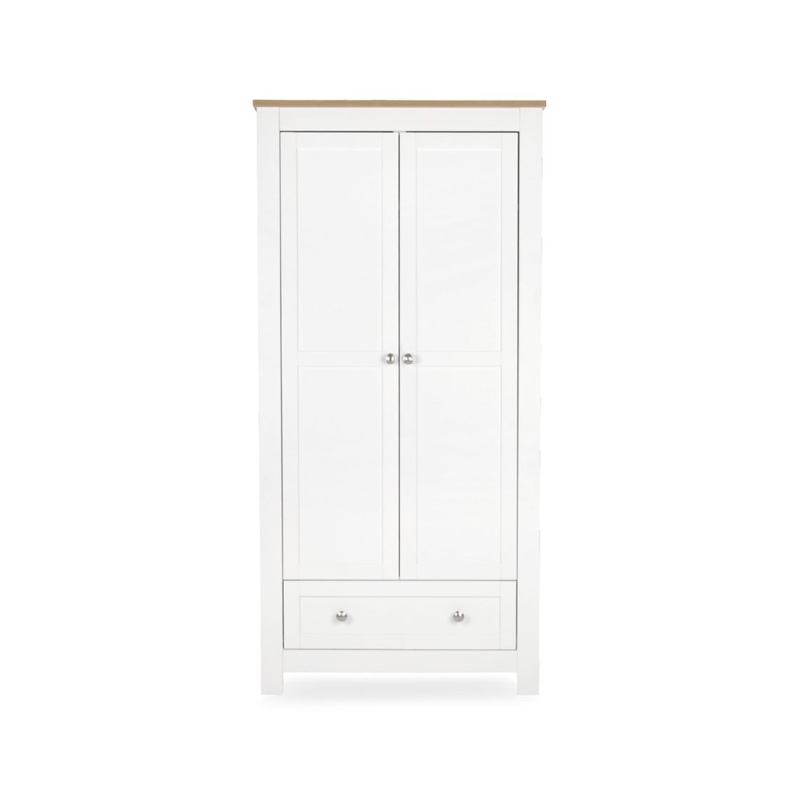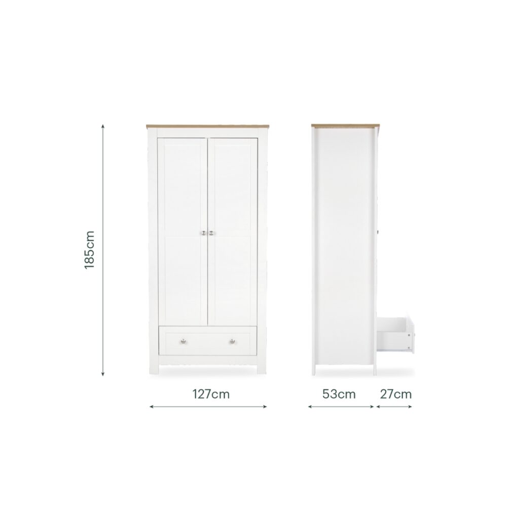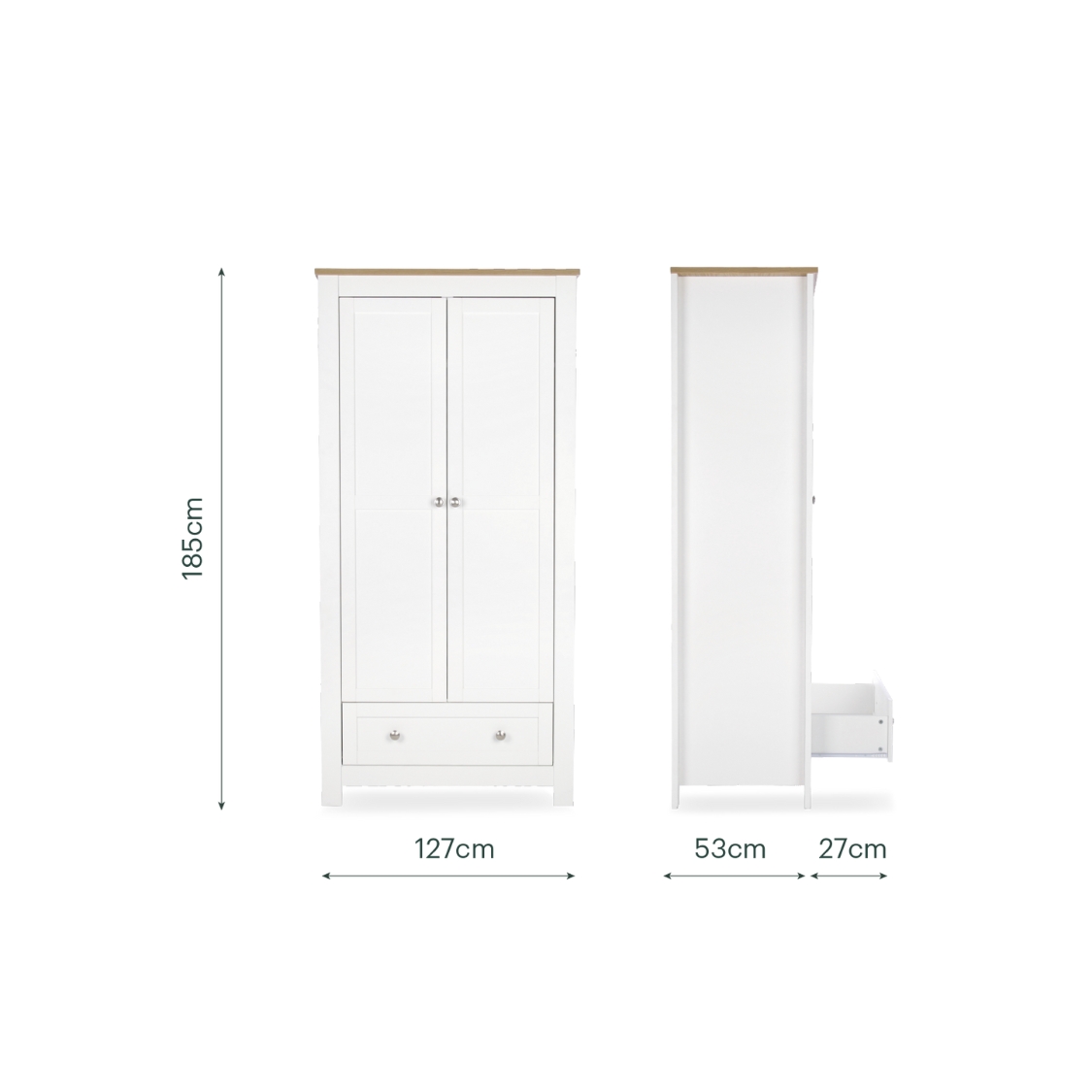 The wardrobe includes two adjustable hanging rails, internal shelving and a wide lower drawer, providing flexible storage for clothing,bedding and everyday nursery item