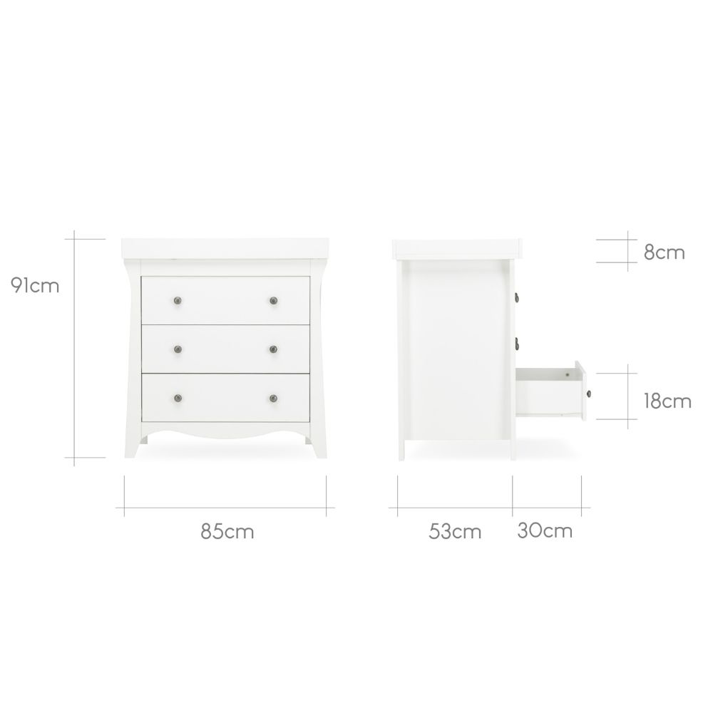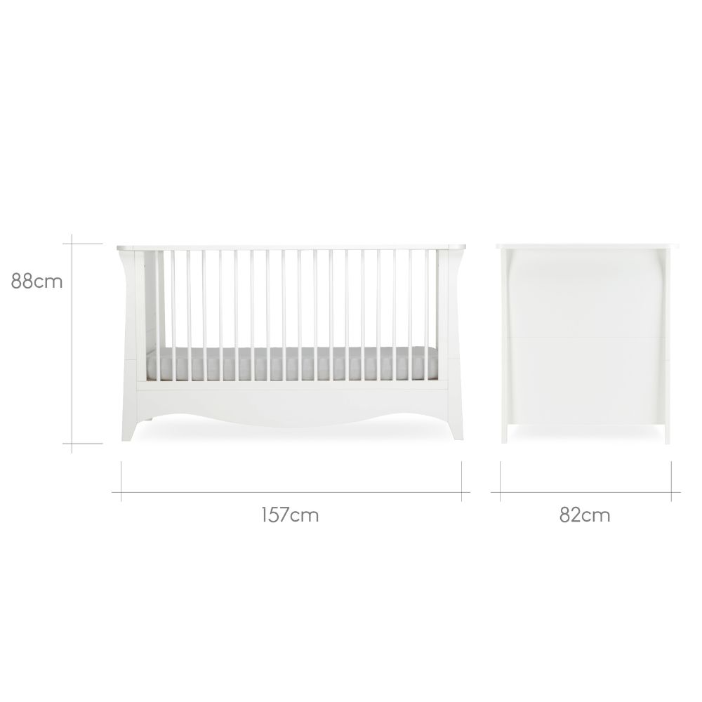 - The Clara Cot Bed measures 88 x 82 x 156cm and the 3 Drawer Dresser & Changer measures 91 x 85 x 50cm