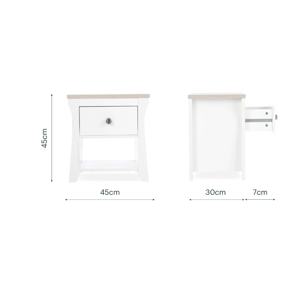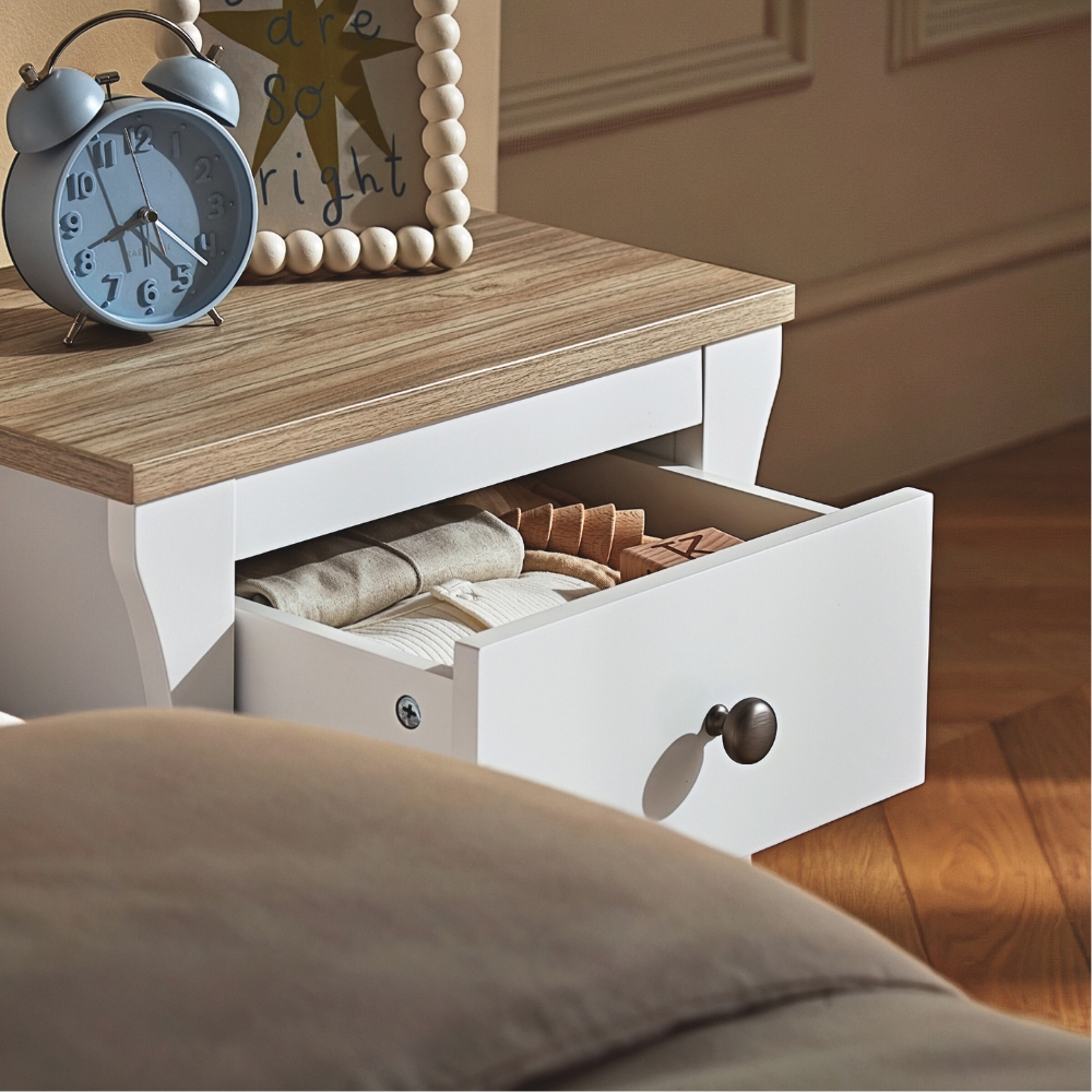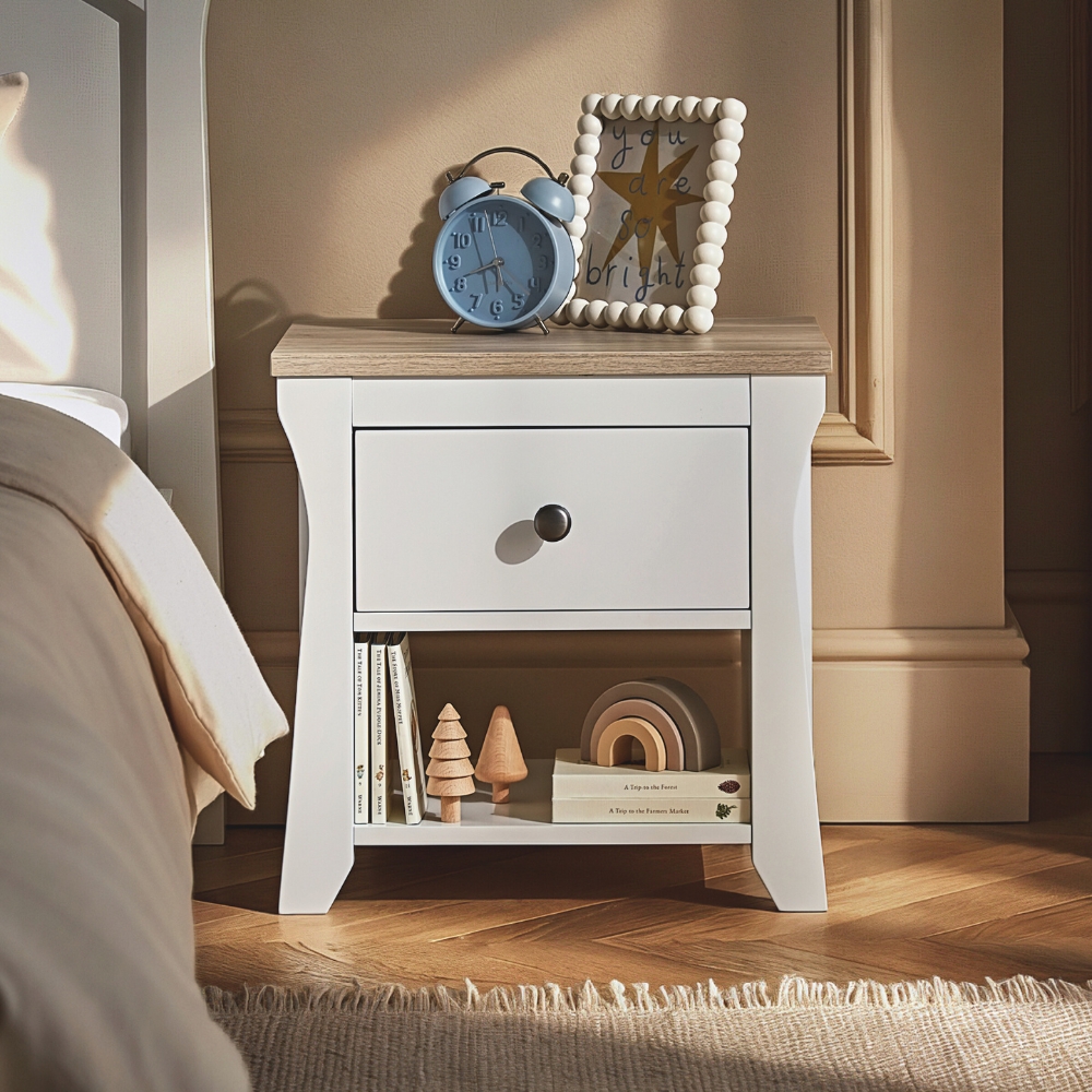 Finished in a soft Cashmere tone with warm Ash detailing, the Clara Bedside Table brings subtle warmth and understated style to your bedroom. Designed to keep essentials close at hand, it features a spacious drawer for hidden storage and an open lower shelf ideal for books, baskets or bedtime items.Proportioned to coordinate seamlessly with the CuddleCo Clara Toddler Bed and CuddleCo Clara Single Bed, it helps create a cohesive, well-considered look throughout the room. Its neutral finish and classic lines allow it to sit comfortably in children’s bedrooms, guest rooms or shared living spaces.