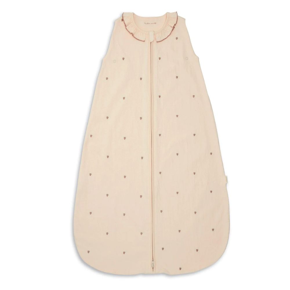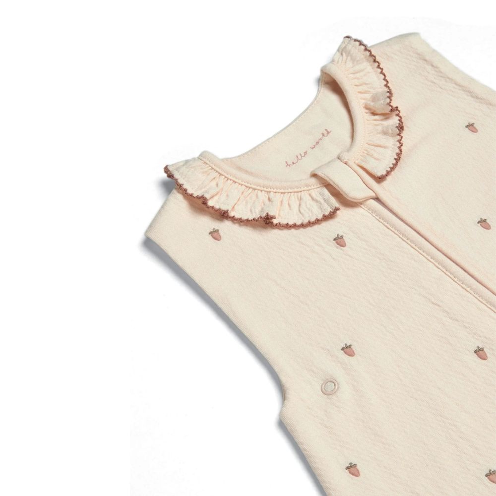 Pale pink textured dreampod, for ages 0-6 months. With delicate strawberry embroidery detail. Frilled collar detail with contrast picot trim. In lighter 1.0 Tog jersey fabric, perfect for the summer months.