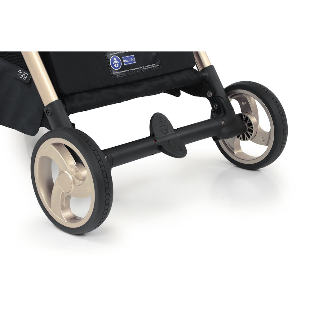 Compact puncture free tyres feature a unique egg-shaped tread pattern, with the stroller leaving its mark wherever it goes. Designed for superior handling and the optimum smooth ride, eggZ® has been fitted with puncture free PU tyres as standard. The brake pedal is flip flop friendly with an extra visual ‘traffic light’ green and red indicator.