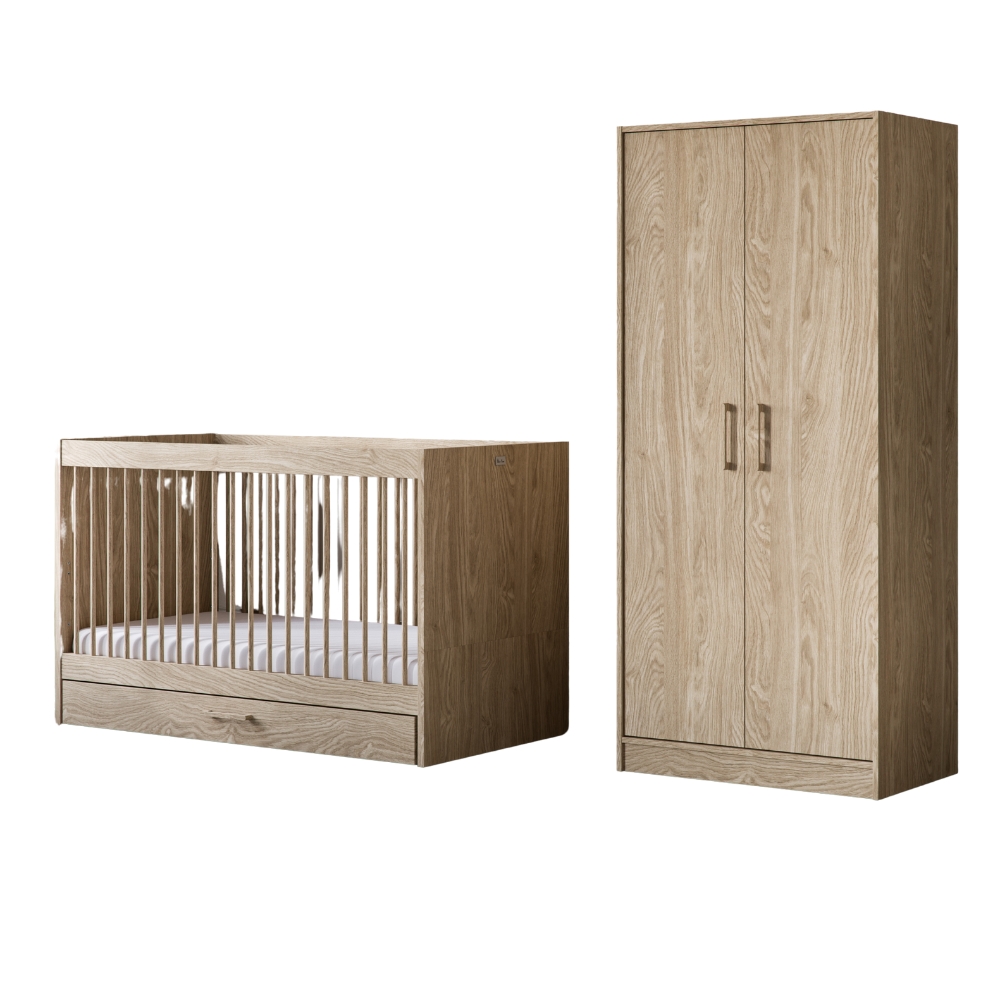 Create an elegant, sophisticated nursery with the Geneva 2-piece furniture set. This collection includes a convertible cot that transforms into a toddler bed with under-bed storage, perfect for smaller rooms, plus a matching changing dresser. Built to last, the natural oak finish and textured details bring a soothing, Scandi-inspired style that will grow with your child.