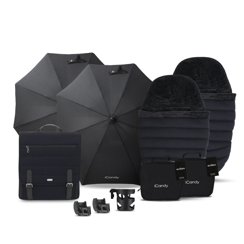 Complete Bundle – Peach7 Pushchair, Carrycot, Elevators, 2 Footmuffs, 2 Raincovers, 2 Screens, 2 Parasols, Car Seat Adaptors, 1 Bag, 1 Cupholder & 2 Clamps