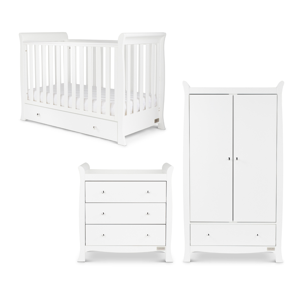 The Snowdon Mini 3 Piece includes the 4 in 1 Mini Cot Bed, plus full-size Changing Unit and Wardrobe. These pieces have a distinctive and traditional sleigh design and are perfect for the space conscious parent.