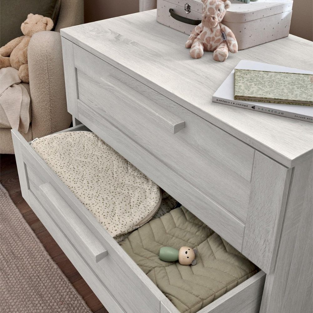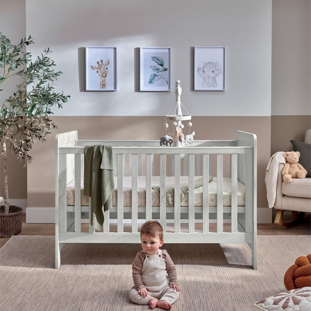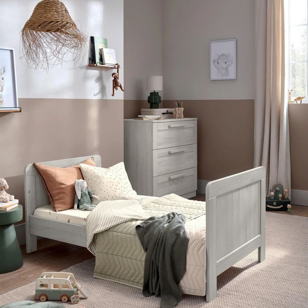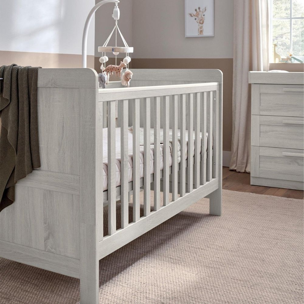 Our Atlas Small Cotbed range is a beautifully timeless three-piece nursery furniture set designed to make the most of smaller spaces without compromising on style or comfort. Thoughtfully crafted, the Small Cotbed fits snugly into more modest nurseries while providing a comfortable and spacious sleep environment. As your child develops, the Small Cotbed easily transforms into a toddler bed, keeping them sleeping soundly up to four years of age. Teamed with the Atlas wardrobe and dresser, this woodgrain finish collection creates a cohesive and classic nursery look. Meanwhile, its adjustable elements and storage remove the need to upgrade your furniture as your little one grows.
