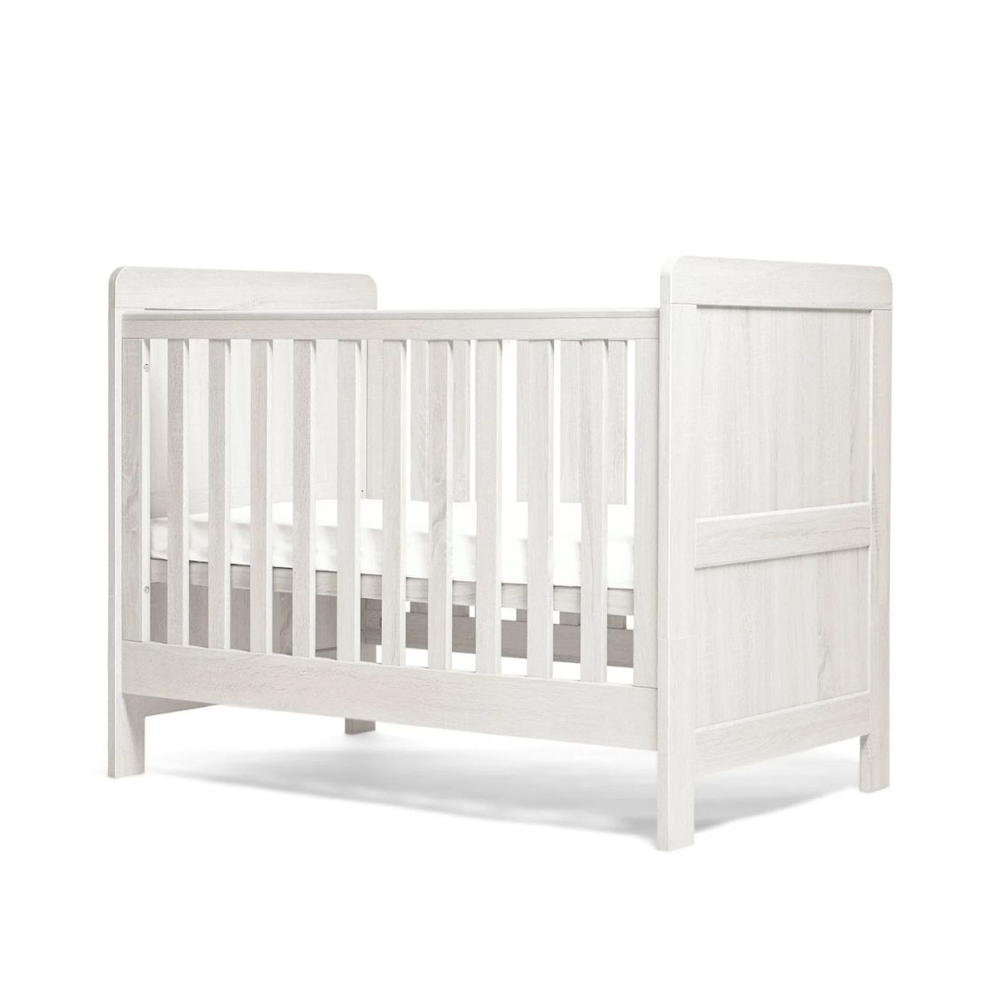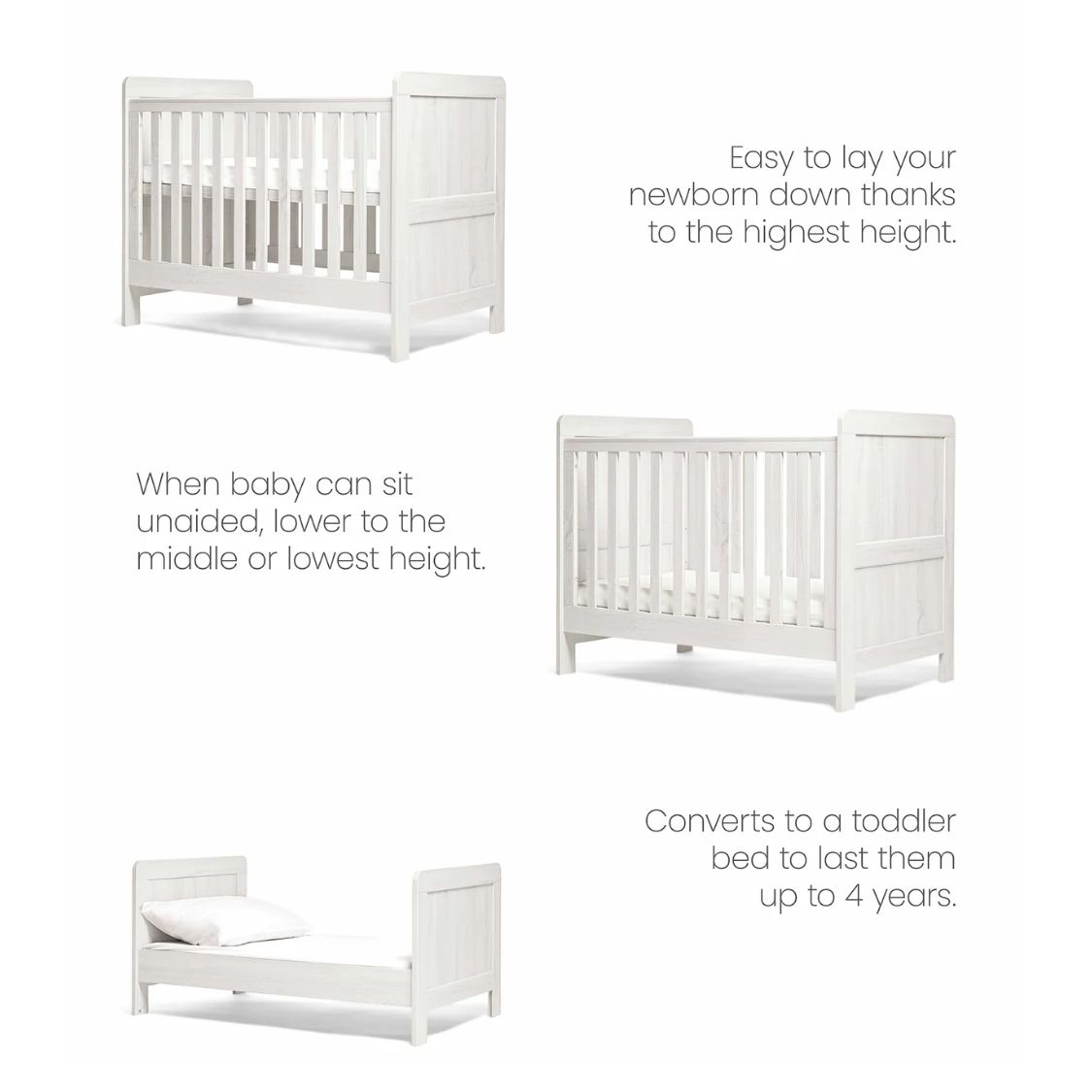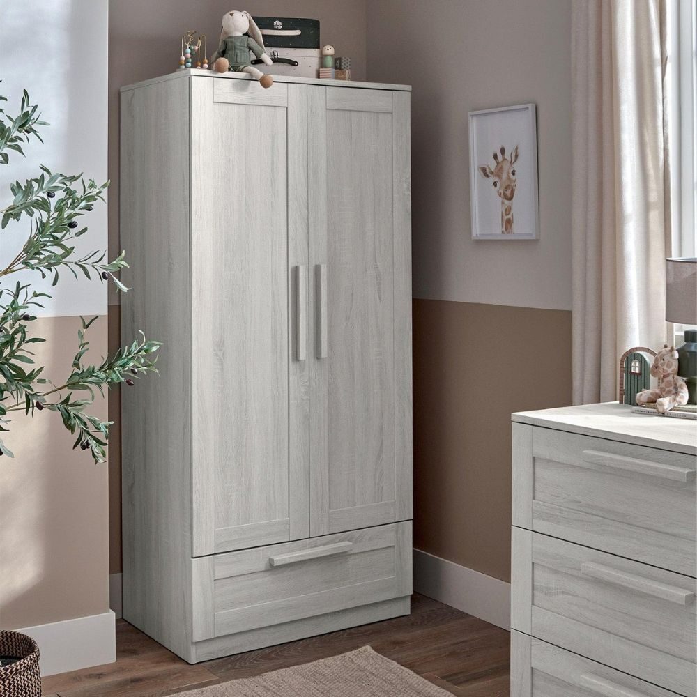Our Atlas Small Cotbed range is a beautifully timeless three-piece nursery furniture set designed to make the most of smaller spaces without compromising on style or comfort. Thoughtfully crafted, the Small Cotbed fits snugly into more modest nurseries while providing a comfortable and spacious sleep environment. As your child develops, the Small Cotbed easily transforms into a toddler bed, keeping them sleeping soundly up to four years of age. Teamed with the Atlas wardrobe and dresser, this woodgrain finish collection creates a cohesive and classic nursery look. Meanwhile, its adjustable elements and storage remove the need to upgrade your furniture as your little one grows.