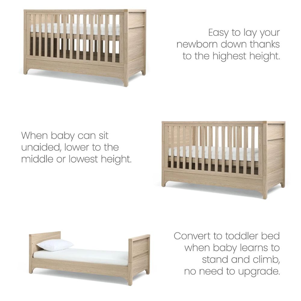 Your little one will enjoy the sweetest dreams in our Barton cotbed, designed to grow with them from newborn to toddler. With three adjustable base heights and simple conversion into a toddler bed, it will keep them sleeping soundly up to around 4 years old. With a warm natural oak finish, Barton’s beautifully simplistic design—with its soft curved-edge feet—fits effortlessly into any nursery style.