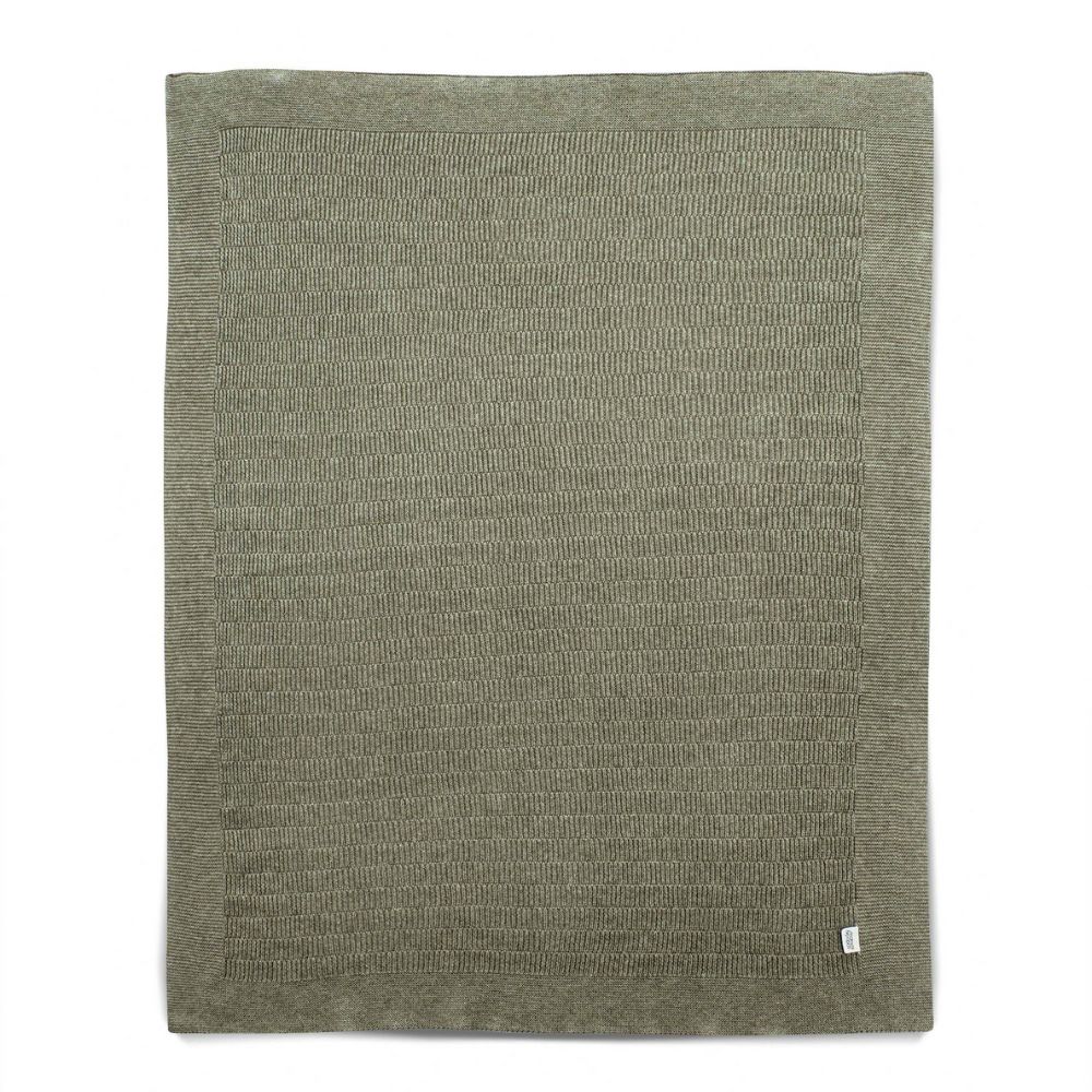 With its stylish rib knit pattern and earthy khaki shade this soft knitted blanket adds rich texture to baby’s nursery while making naps and snuggles extra cosy.