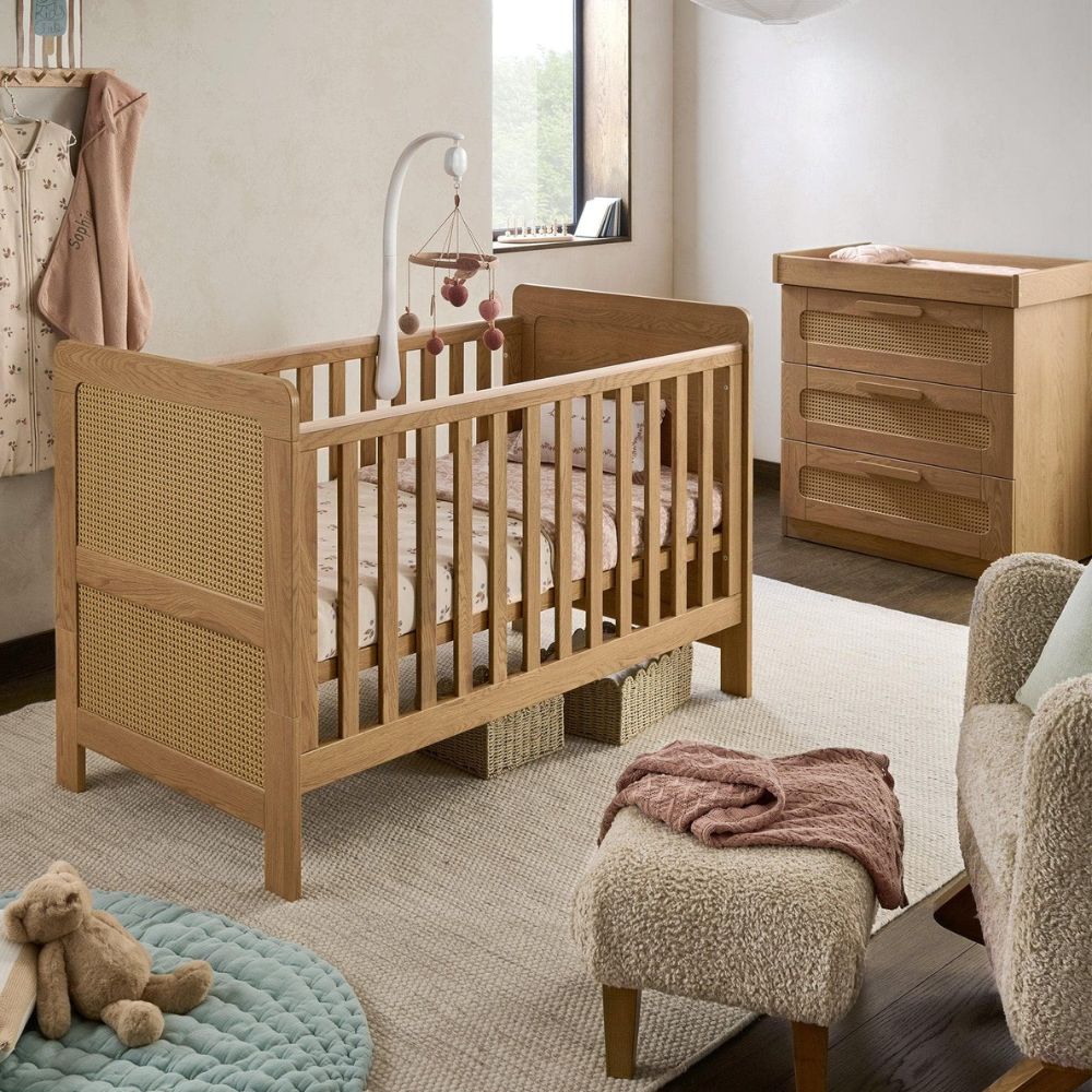 Capturing the quietly luxurious and natural quality of beautiful rattan, this collection features warm wood, mid-century style curves and a backed rattan-effect detail, resulting in a nursery range that’s effortlessly stylish, naturally calming and full of character.