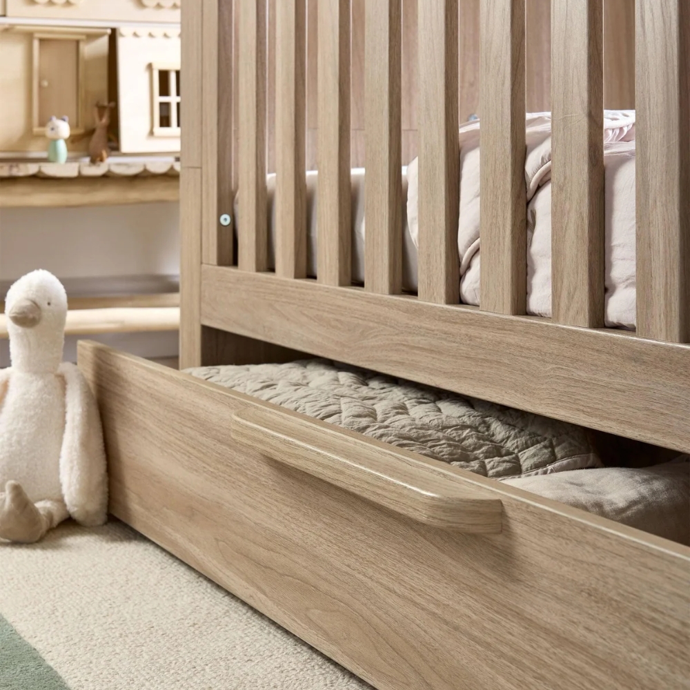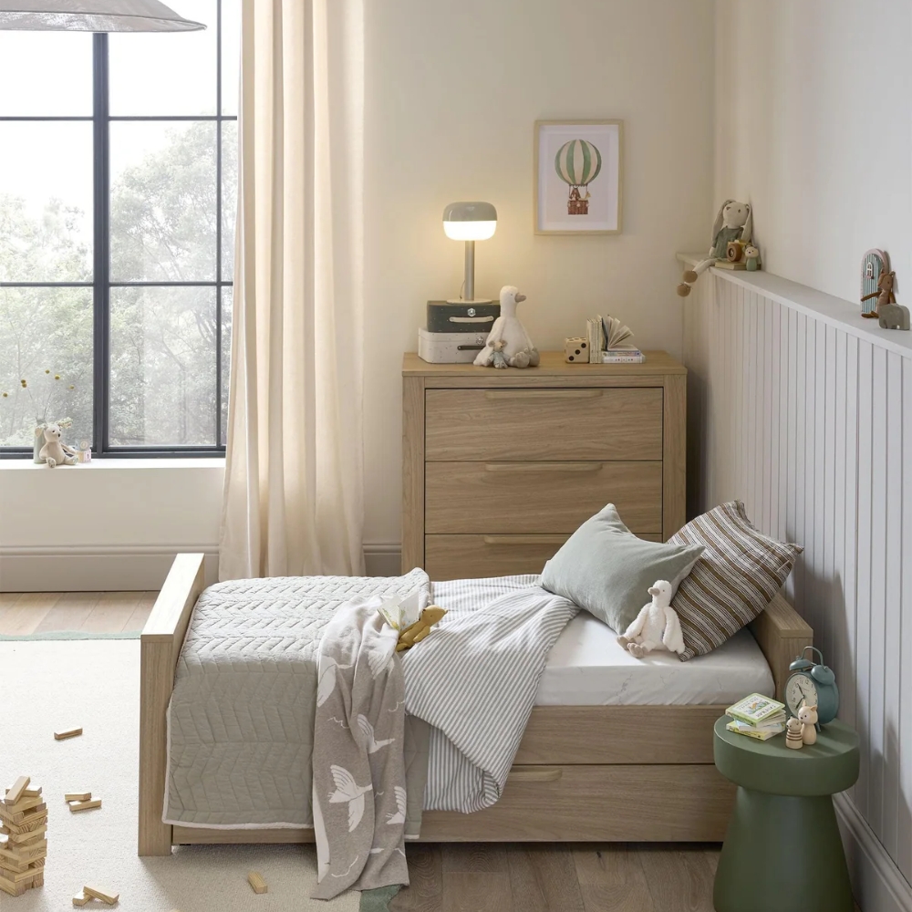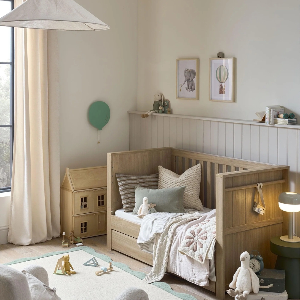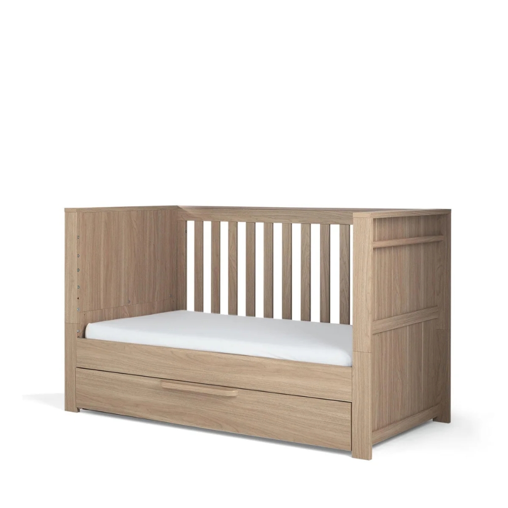 The grey cot converts into a toddler bed and day bed when the time is right. There’s a handy drawer to tuck away blankets and bedding.