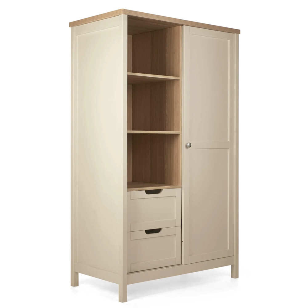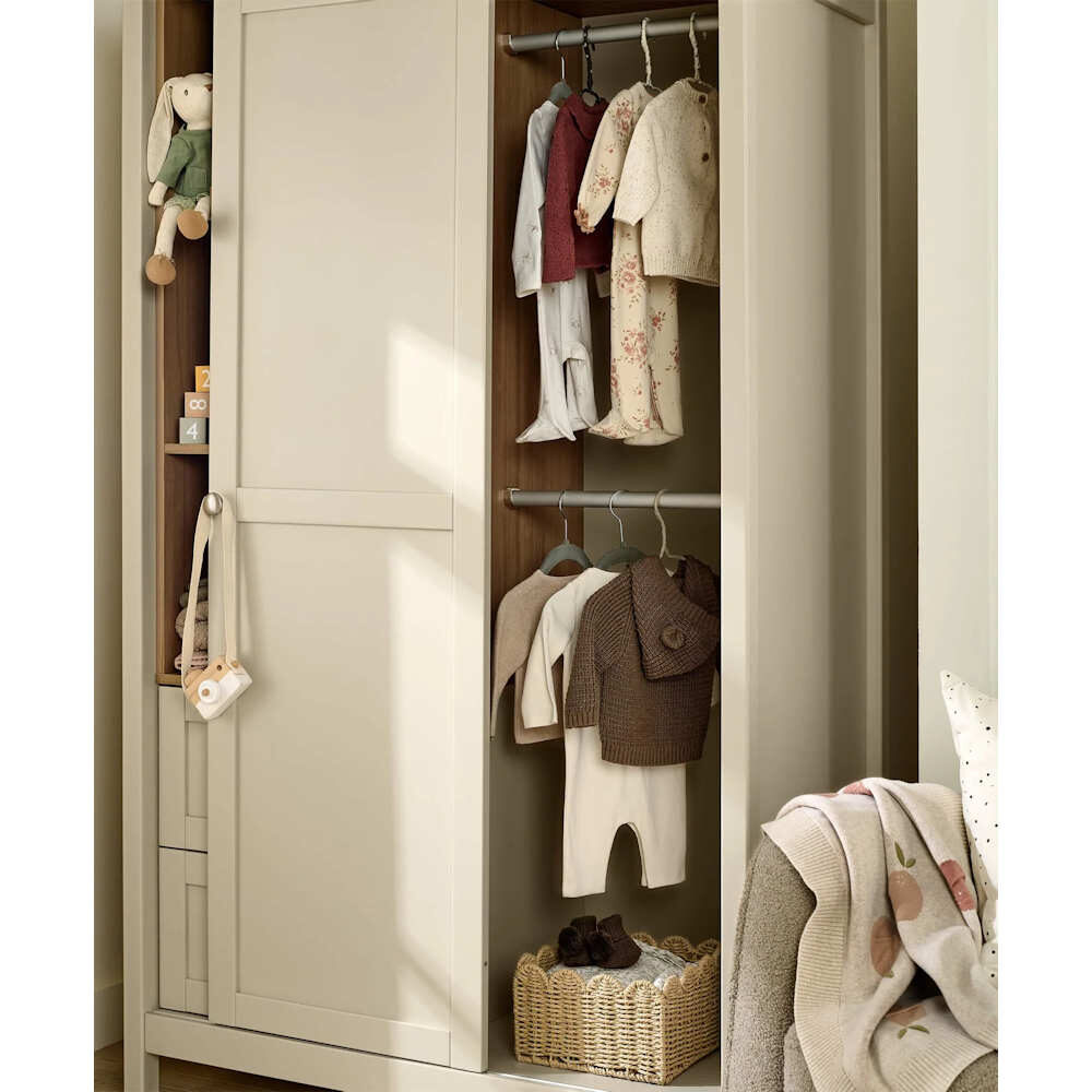- Wardrobe features an easy sliding door, ideal for maximizing your nursery space, plus 2 removable hanging rails and 2 removable shelves, allowing you to easily adjust and customize your storage space to suit your needs as they change.