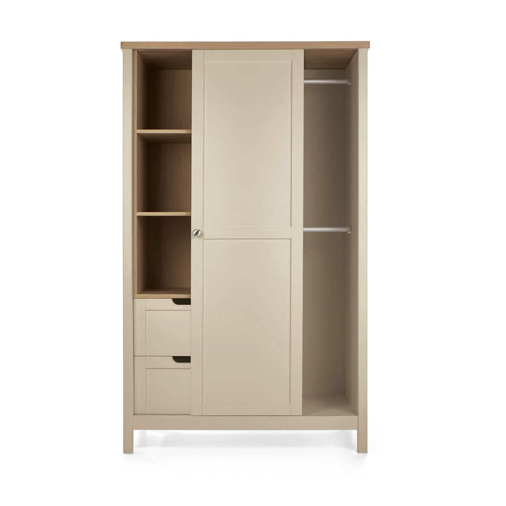 Keep your little one’s nursery neat and tidy with our Harwell wardrobe. It’s got a clean finish and two tone detailing, perfect for pairing with the rest of our range. With an easy sliding door, 2 removable rails for hanging clothes and 3 removable shelves, you can store everything from baby’s favourite books and toys to clean outfits and bedding. The wardrobe drawers are also soft close so you won’t disturb baby.