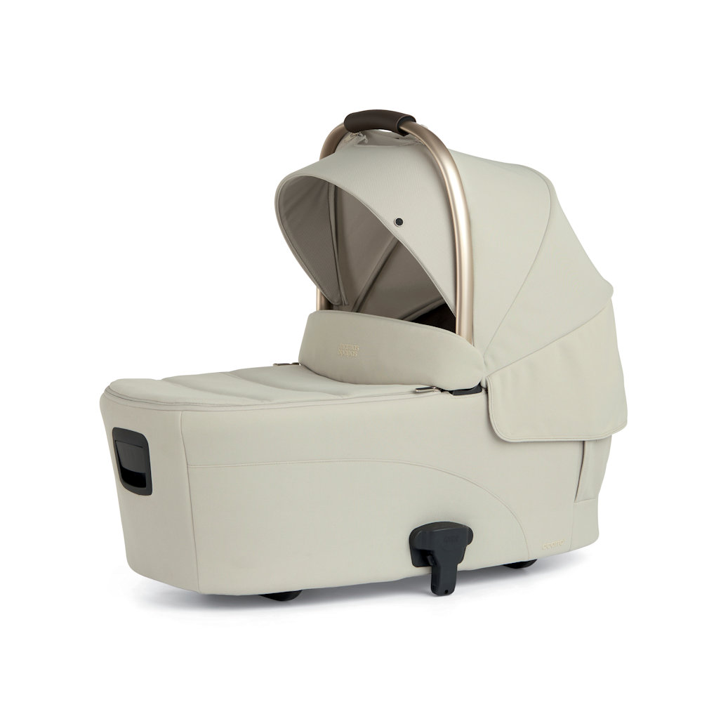 Approved for overnight sleep, this carrycot is designed for use with the Ocarro 2 pushchair and interior carrycot stand* to deliver the ultimate in comfort, convenience and safety. The cushioned, lie-flat mattress supports a natural sleeping position for newborns, perfect for daytime napping and safe overnight rest, whether on the chassis or portable stand. A fold-down, removable apron allows you to settle baby quickly and quietly, while the hood’s ventilation panels keep them shaded, cool and comfortable. Updated with premium quilted lining, featuring moisture-wicking and antibacterial properties, it’s as practical as it is plush. Styled to perfectly complement the Ocarro 2 Crema, our carrycot showcases the same soft, recycled fabrics in luxe brown tones and matte metallic accents for a comforting take on modern luxury.