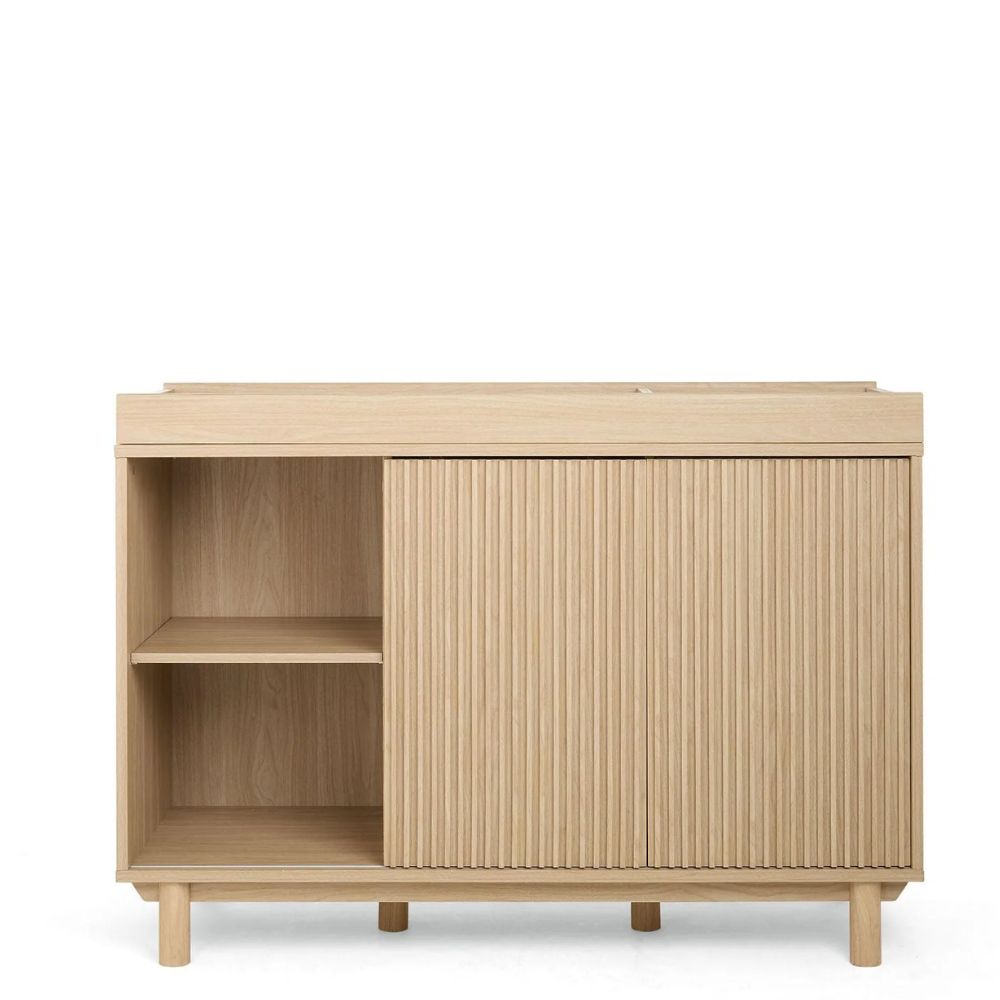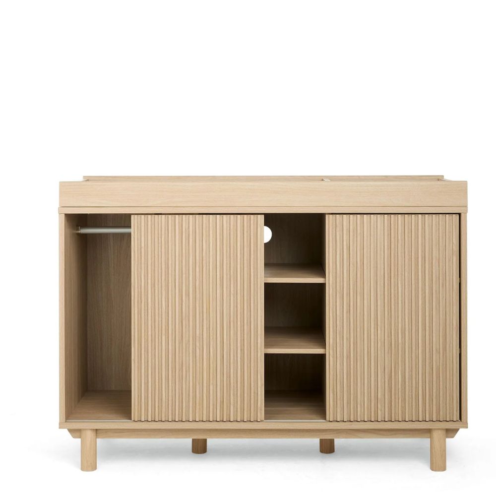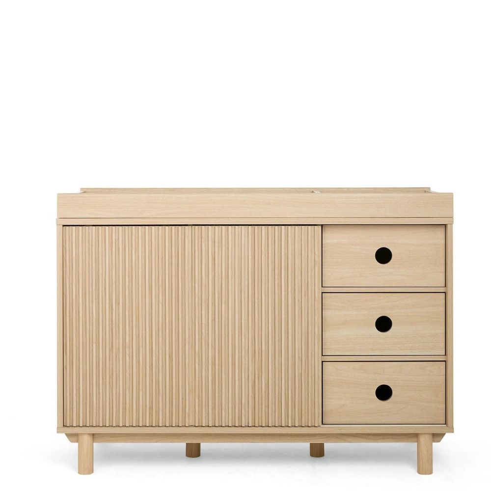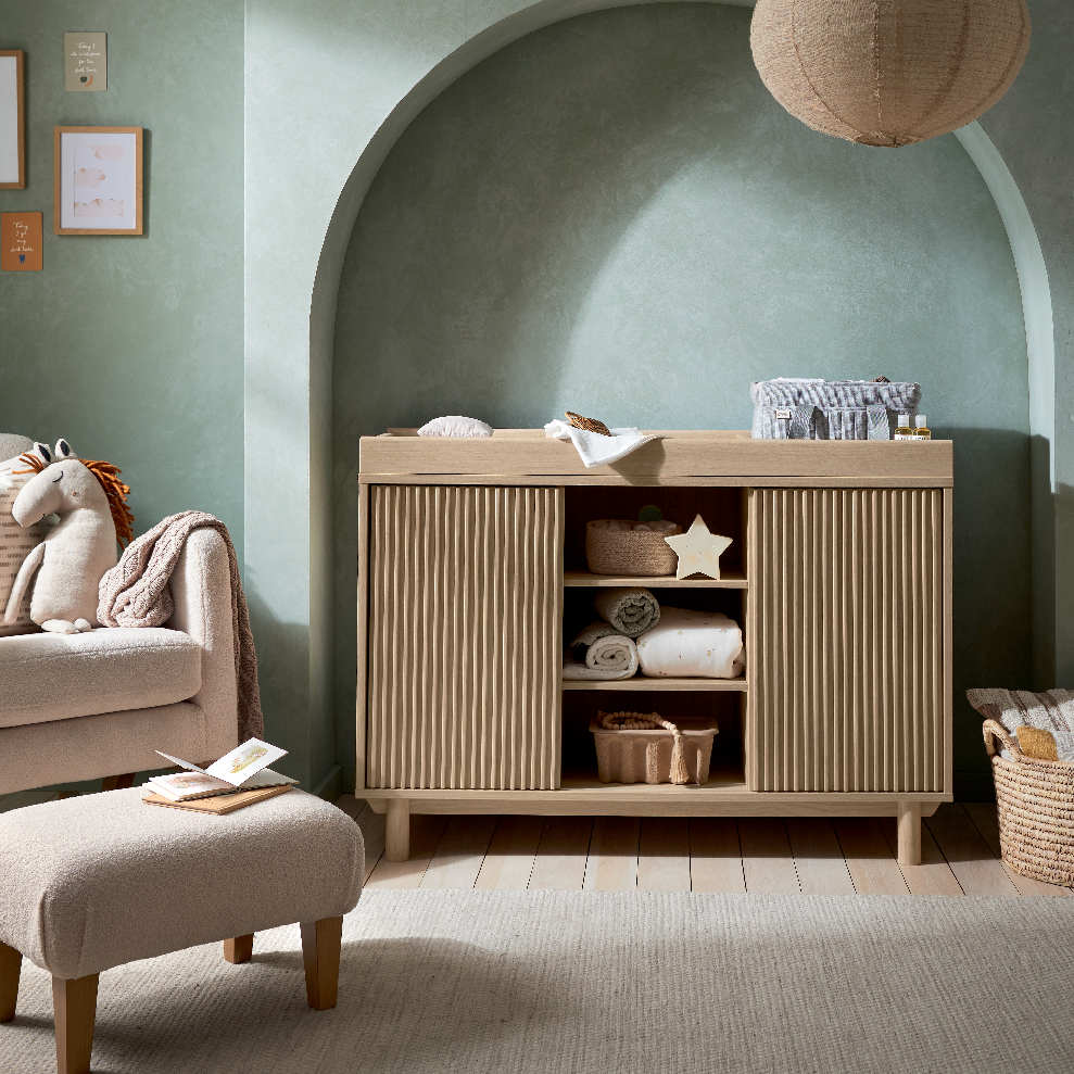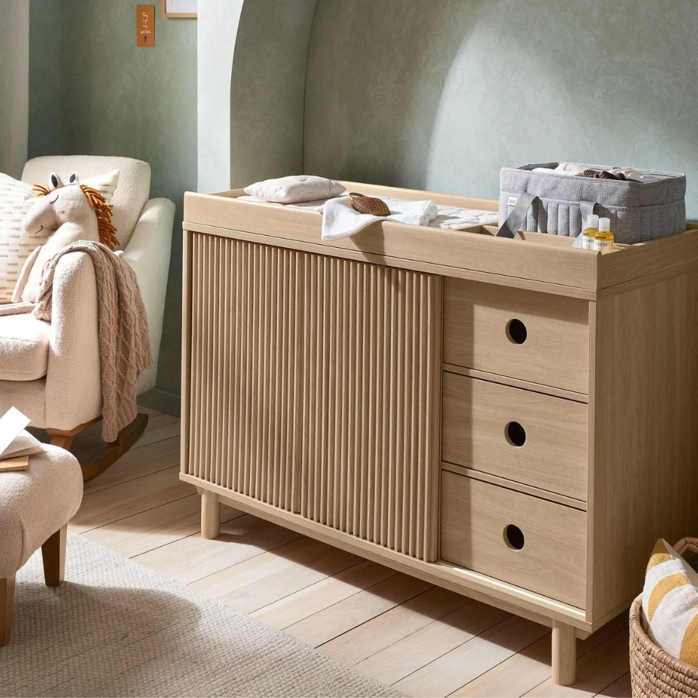 The Oska wide dresser changer combines style, convenience and adaptability for a sleek storage solution that lasts far beyond the baby years. Featuring an extra-wide, removable changing top, it provides ample space for all your changing essentials before seamlessly transforming into a stylish dresser. Its built-in drawers, along with a removable hanging rail and adjustable shelves concealed behind sliding wooden doors, help keep everything perfectly organised with flexible storage that adapts as they grow. Inspired by Scandinavian and Japanese design, its warm oak tones, slatted wood details and soft curves bring a naturally soothing and contemporary look.