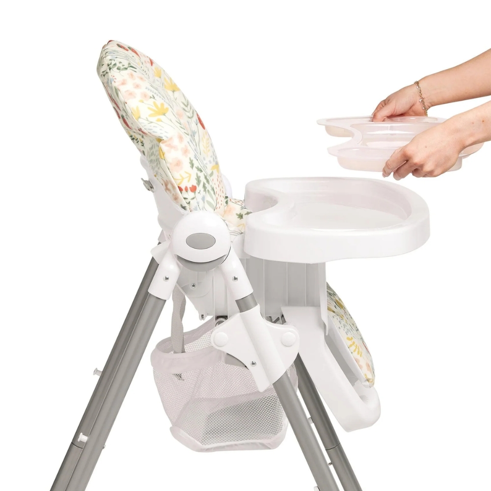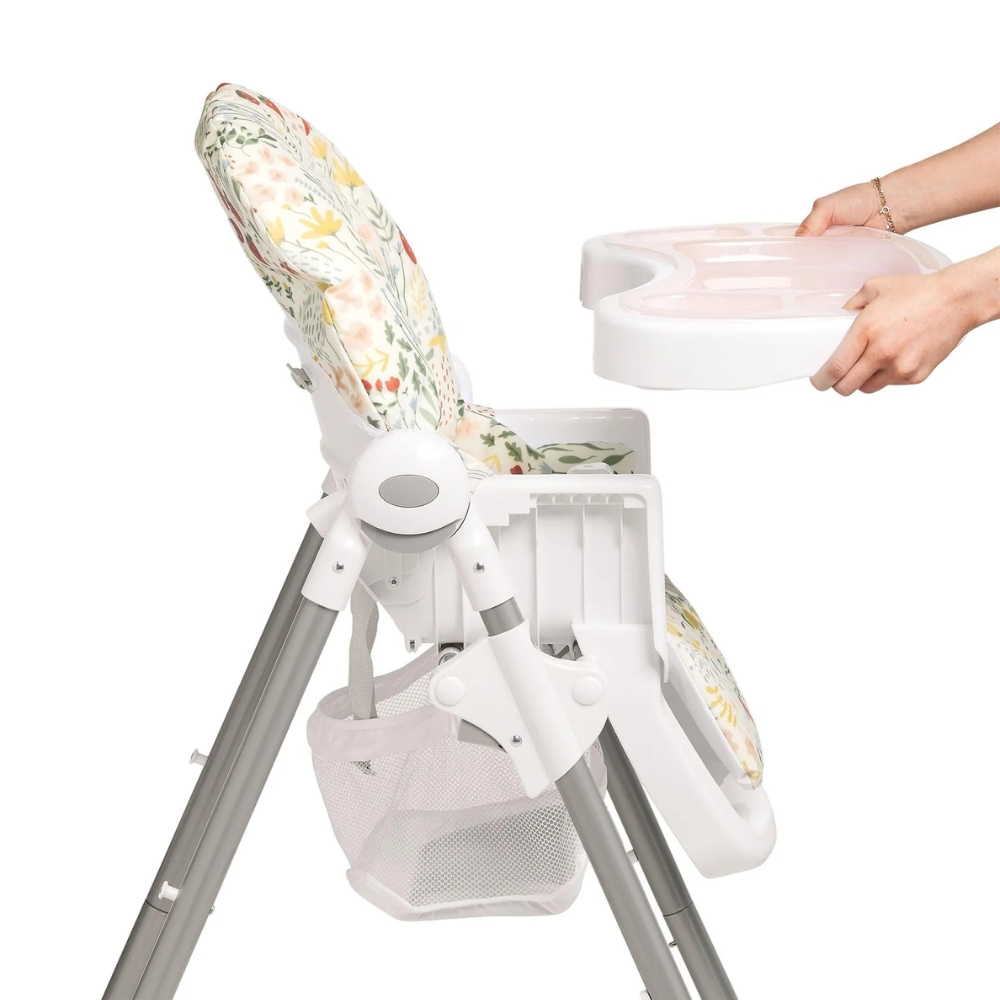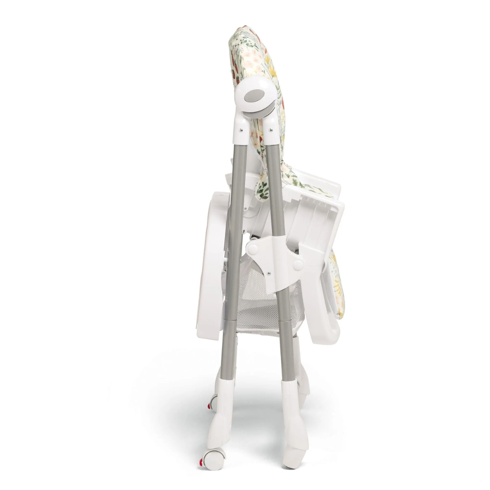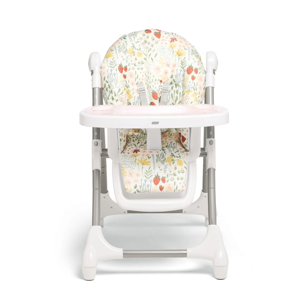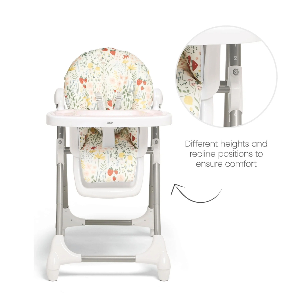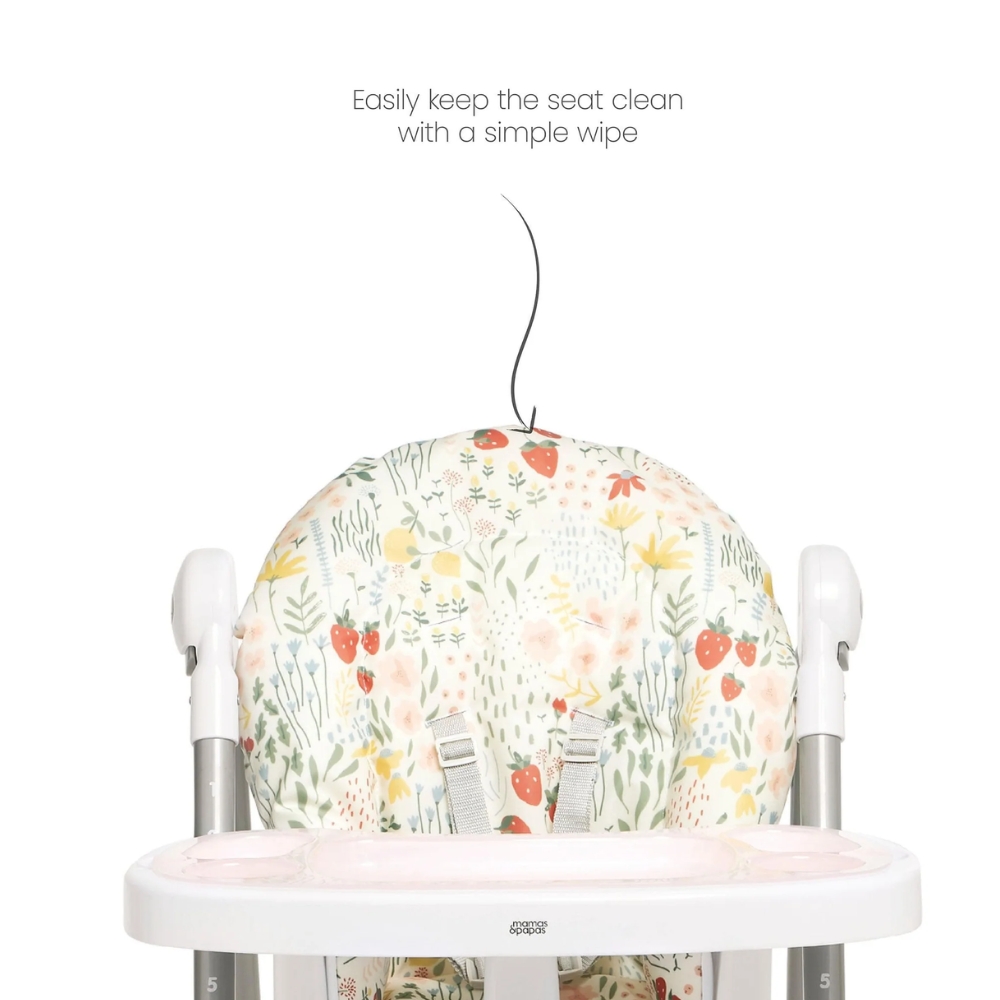 Our best-selling wipe-clean highchair! Padded seat made from 100% recycled polyester, with 6 adjustable height settings and three recline adjustments, so your child can always join you comfortably at the table. Removeable tray with three adjustable tray settings, so you can adjust tray position as they grow. 5-point harness to prevent slips and falls. In a fruity print inspired by nature.