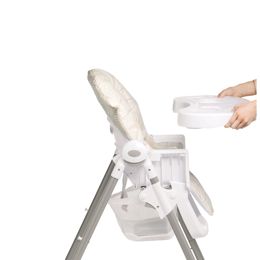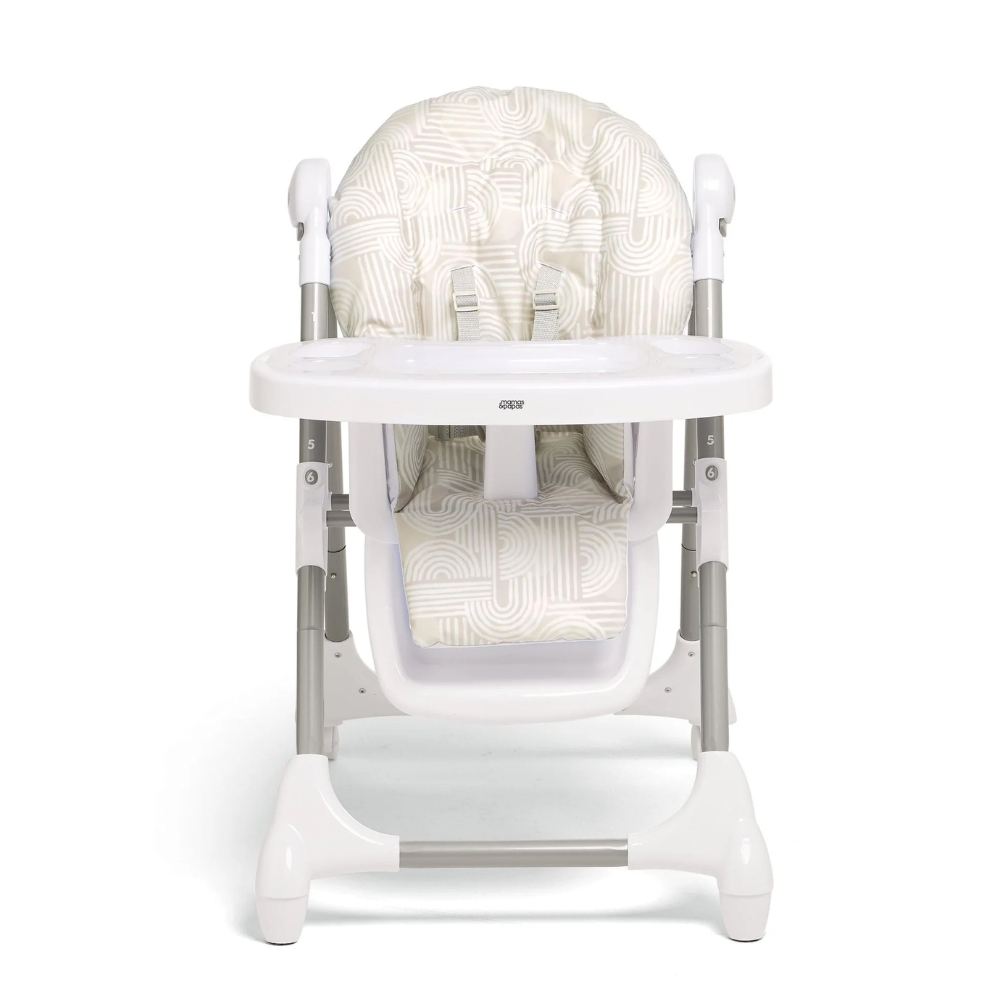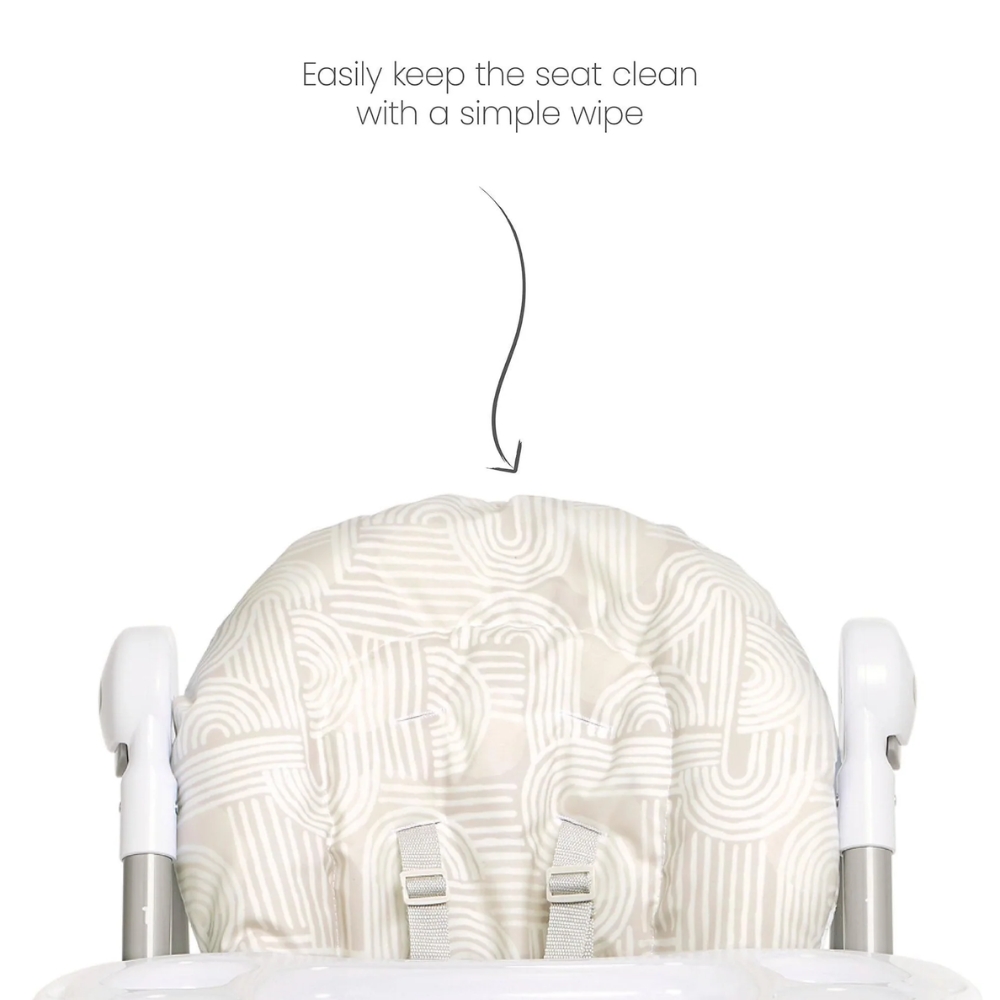 Our wipe-clean Snax highchair has 6 adjustable height settings and a removable tray, meaning your child can always join you at the table. With three recline adjustments it’s easy to adapt to your little one’s seating preference. The three adjustable tray settings mean you can adjust the space between your child and the tray as they grow, so they can easily reach their food. The 5-point harness prevents any slips and falls. In our Curious Alphabet print featuring hidden icons, including toadstools, bees and teacups, designed to inspire during mealtimes