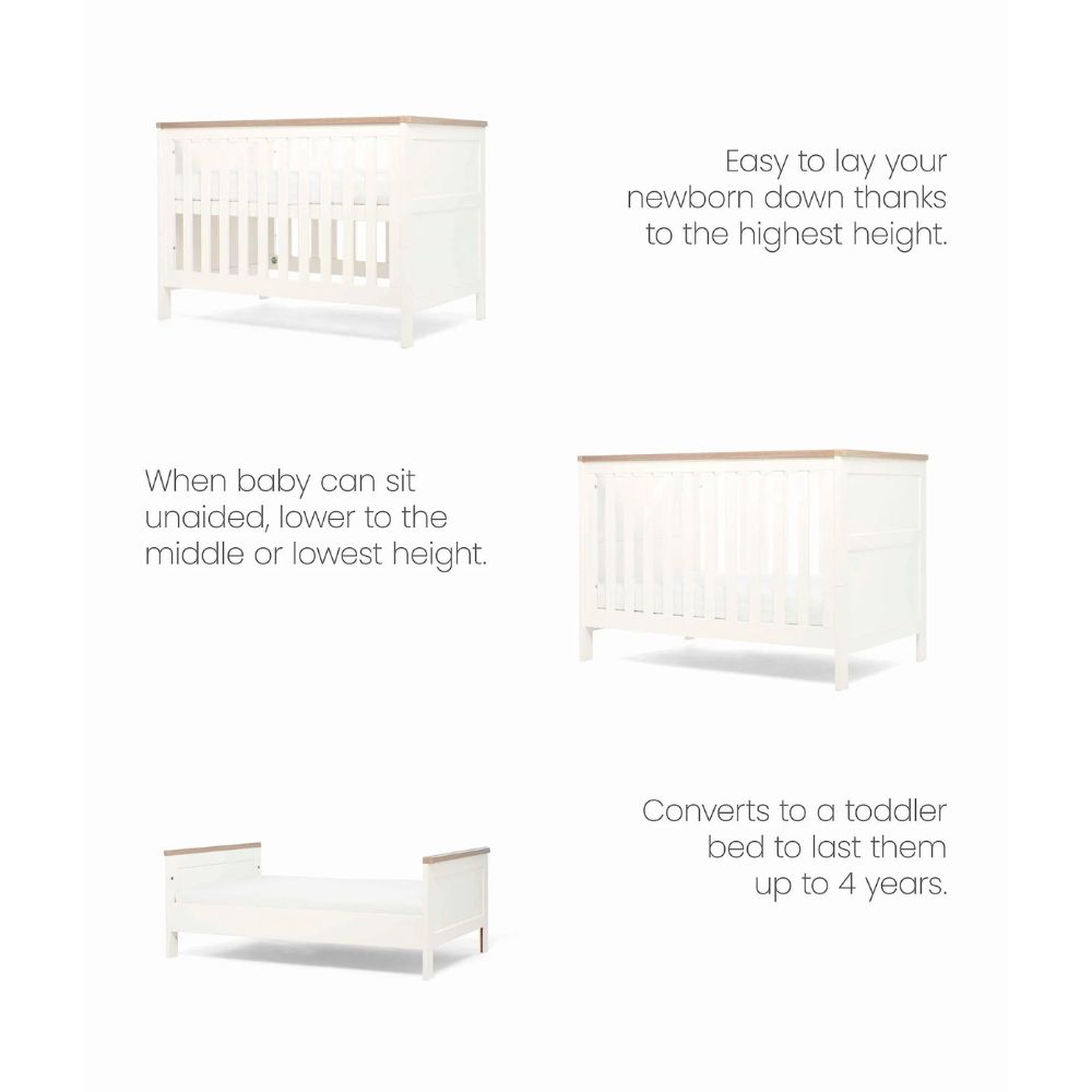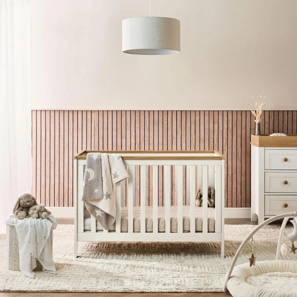 Our Wedmore Small Cotbed range is a modern classic three-piece nursery set designed to kit out smaller spaces without sacrificing style or comfort. The Small Cotbed is carefully designed to fit perfectly in more compact nursery layouts while providing your little one with a roomy and comfortable sleep space. As your child grows, the Small Cotbed easily converts into a toddler bed, offering restful sleep until they reach four years old. Combined with the Wedmore wardrobe and dresser, this neutral two-tone set with soft wood effect accents creates a cohesive and stylish look. Plus, its adjustable features and ample storage ensure you won’t need to replace furniture as your little one grows.
