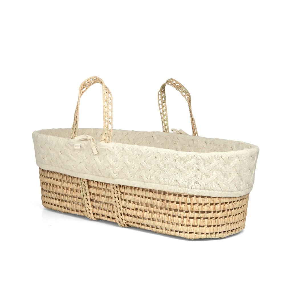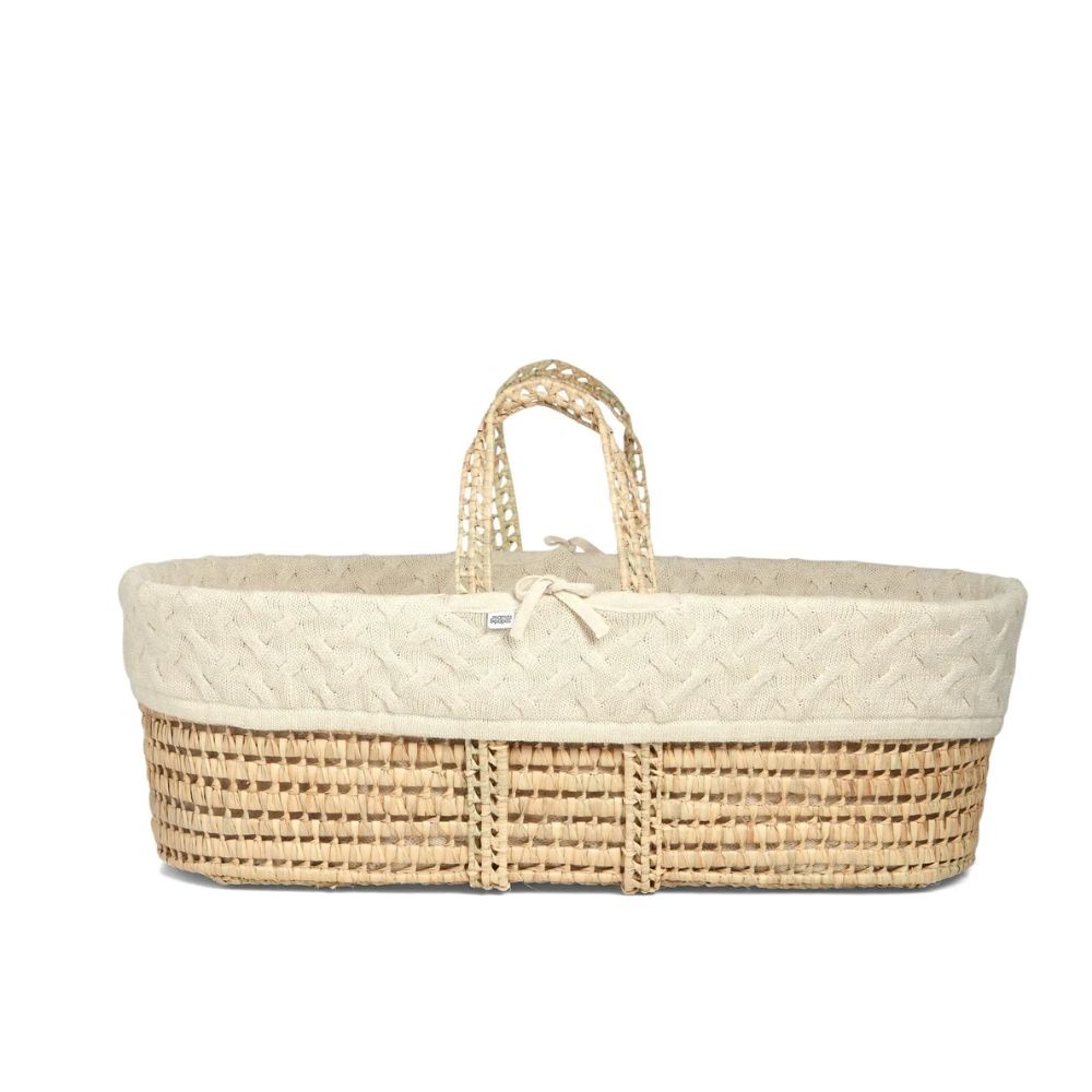 Natural palm Moses basket, with this range’s signature neutral tones. Lined with chunky cable knit liner, crafted from a cream marled yarn.