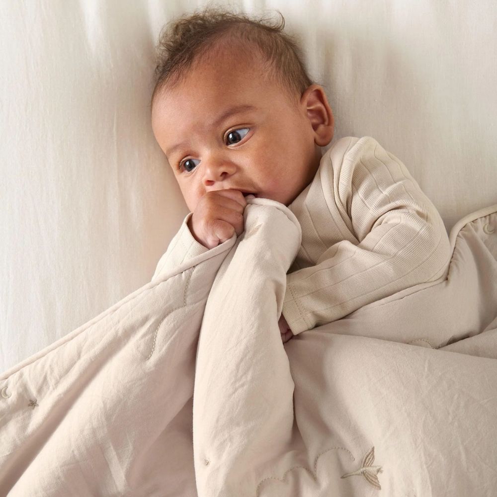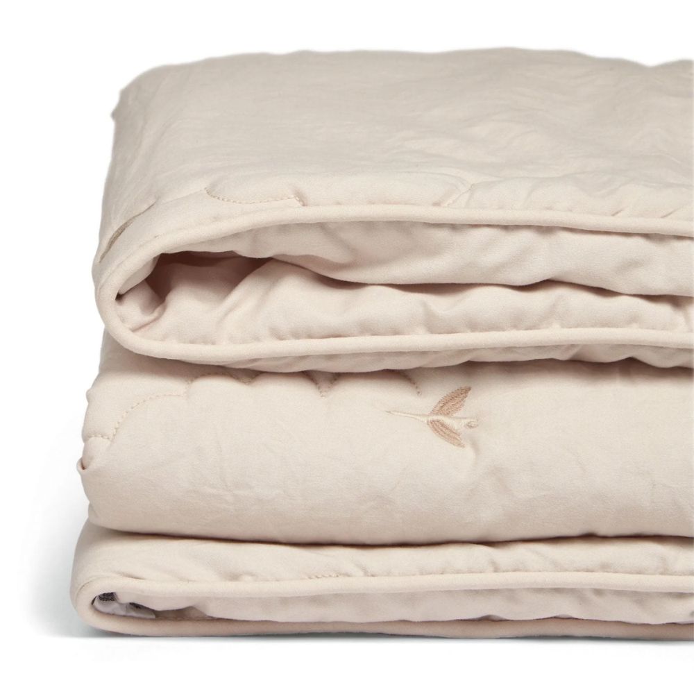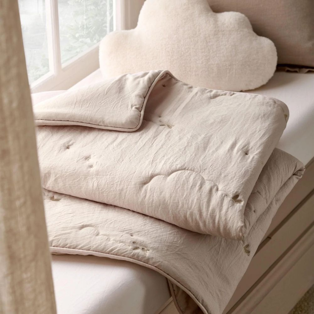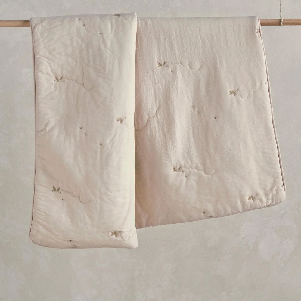 A soft, lofty laundered-feel 4.0 Tog quilt with delicate cloud quilting and ‘flying duck’ embroidery. With a neutral base this quilt sits effortlessly in most nurseries, while the embroidered ducklings are signature to this range. Finished with deluxe piped edging