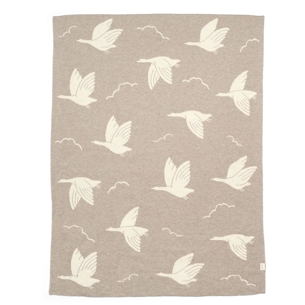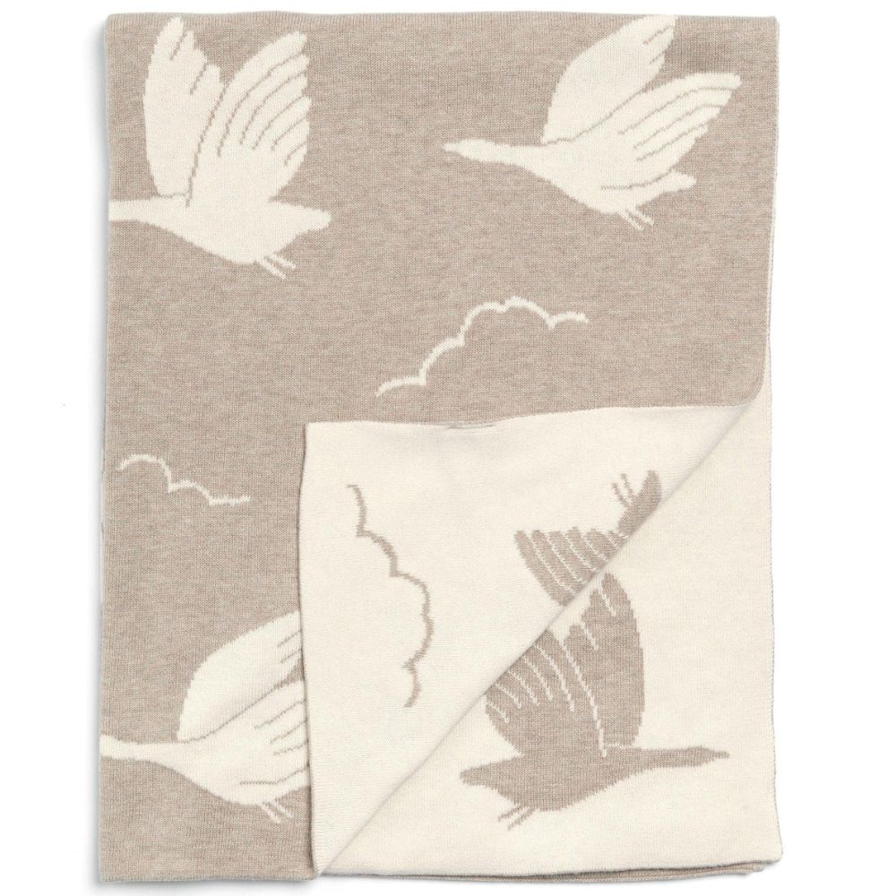 Light-weight knitted cotton blanket. In mocha brown with off-white flying duck silhouette detail. Same design with opposite colours on reverse. Made from super soft Cotton.