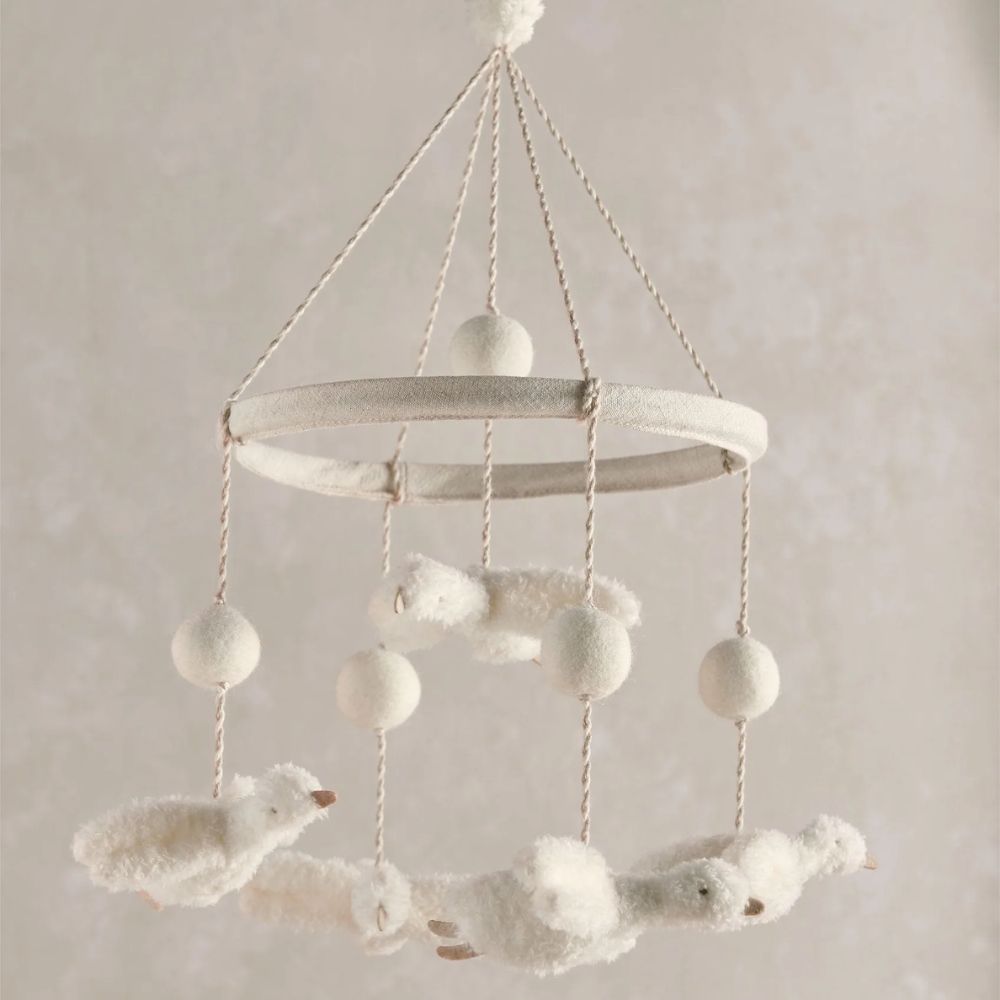 Musical mobile, with 5 plush ducklings flying! Ducklings made from soft borg fabric, with soft-toy filling. In off-white and linen colours. Finished with cloud-like Pom Pom details.