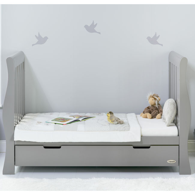The Obaby Stamford furniture range offers families the perfect combination of style, quality and practicality. Standing proud at the top of the range is the beautiful Stamford Luxe sleigh cot bed. Its deluxe, hand-shaped end scrolls flow perfectly into the curved rear side rail creating a unique look which truly sets the Luxe apart from other sleigh cot beds.As your child grows, so does the Stamford Luxe cot bed. Once your child is old enough to progress from cot mode to a toddler bed, you can use the included safety rail for support until they get used to their big bed. Remove the side rails to make a beautiful toddler bed and once they outgrow this, the Luxe can become a useful day bed for lounging and relaxing. The included matching under drawer slides neatly under the cot bed and offers parent’s that much needed extra storage space for their little one’s belongings without taking up valuable space elsewhere.Available in a range of stylish finishes, the Obaby Stamford Luxe sleigh cot bed is the perfect addition to any nursery and coordinates flawlessly with the rest of the Stamford range.Obaby offer a free 5 year guarantee to UK and Ireland when you register your product within 28 days.