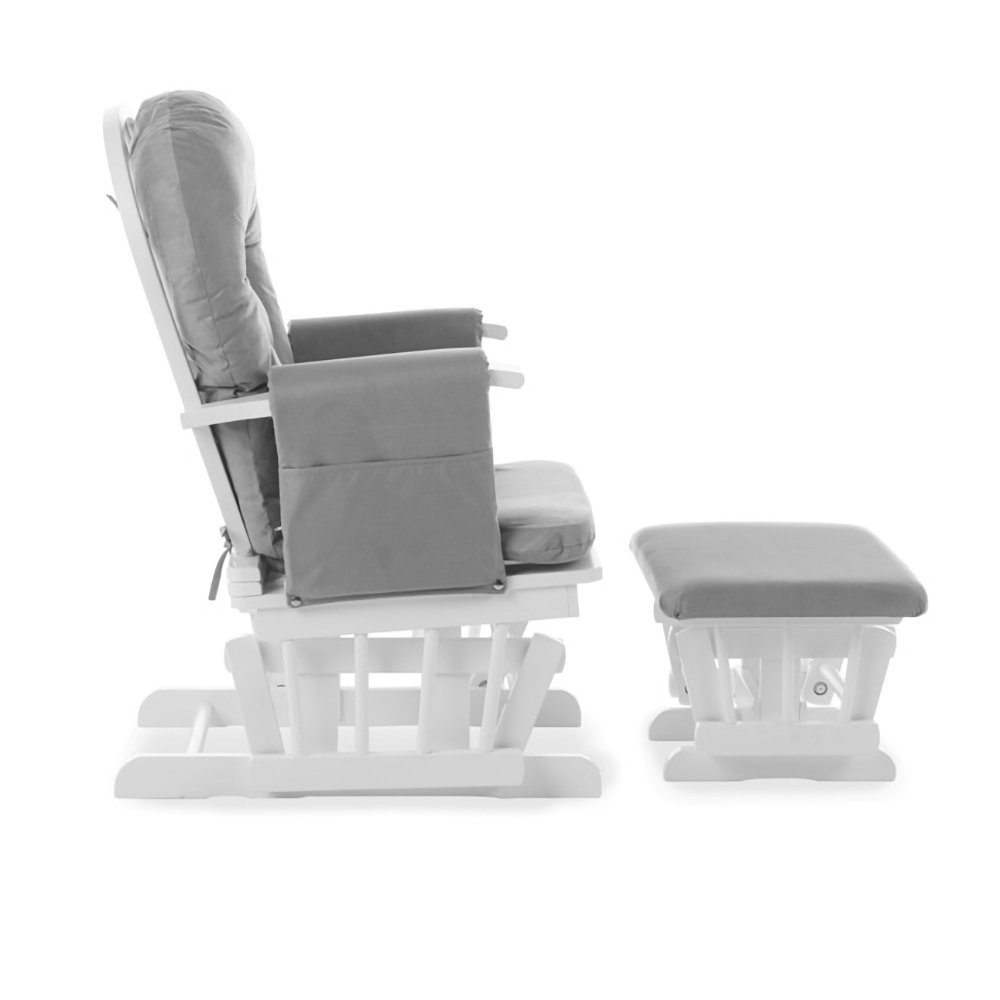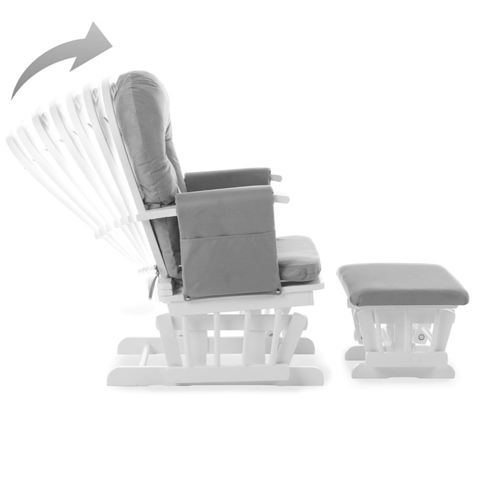 By simply lifting the arm ends, the backrest angle can be effortlessly adjusted by an impressive 7 positions. The included gliding stool perfectly mimics the motions of the chair ensuring nothing gets in the way of your tranquil time. Featuring a comfy padded back and seat cushions to ensure you never want to leave and the padded arm rests each feature a handy storage pocket to keep any important items close to hand. The carefully constructed wooden frame and curved back show off the traditional design with the soft grey tones of the cushions ensuring the chair and stool will coordinate perfectly in any nursery.