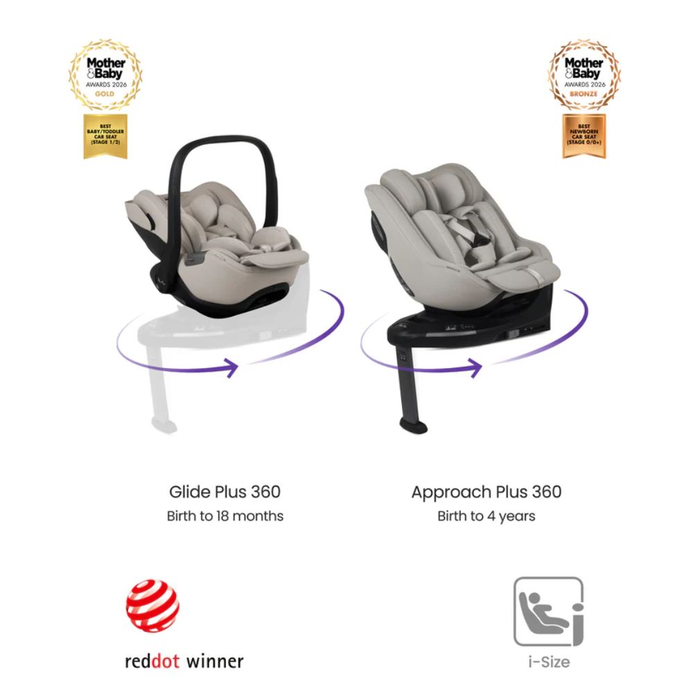 Heading on a family road trip? For even more convenience, we’ve included our lie-flat Glide Plus 360 baby car seat and rotating Base Plus 360. Suitable from birth to 18 months, Glide Plus 360 clips onto Breez’s chassis for a smooth switch from car to travel system. The Base Plus 360 features a 360° spin for easy loading, with ISOFIX and an AgeLock rotation switch for a super secure ride.