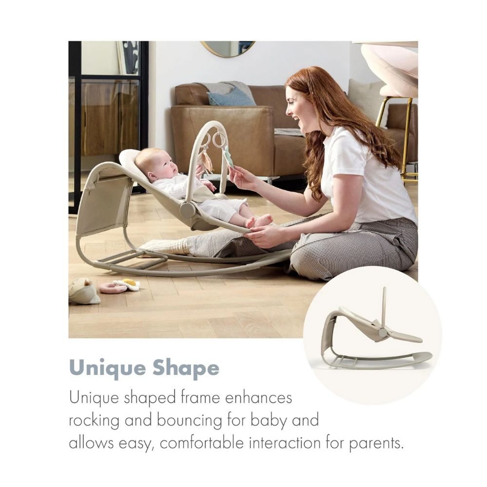- Unique shaped frame enhances rocking and bouncing for baby and allows easy, comfortable interaction for parents.