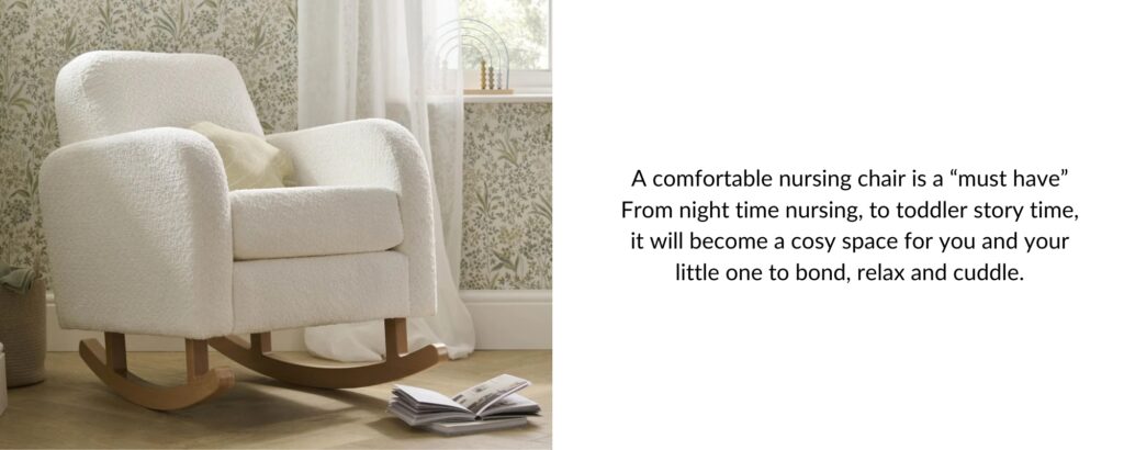 Oh this is a “must have” – Nursing your baby is an experience to enjoy, and comfort is key. A well-padded, ergonomic nursing chair not only supports your back but also provides a calming space for bonding with your baby.