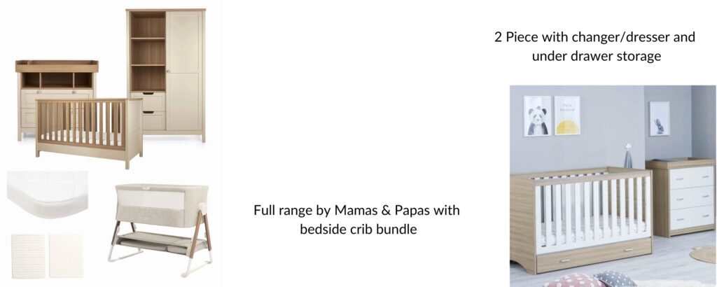 Top Pick: The Mamas & Papas Harwell Nursery Furniture Set is a customer favourite, offering a cot bed, changing table, and wardrobe—all with a modern design and excellent functionality. Plus its on offer with 15% off and a bedside Lua Crib!!!!