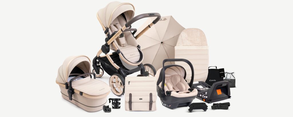 - iCandy Peach 7 – A premium British-designed travel system with a stylish look, all-terrain wheels, and a spacious carrycot. Compatible with iCandy Cocoon car seat, but also works with Maxi-Cosi and Nuna car seats.